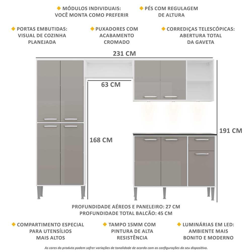 Cozinha Compacta Multimóveis Xangai FG3415 com 3 Leds Armário e Balcão Branca/Lacca Fumê