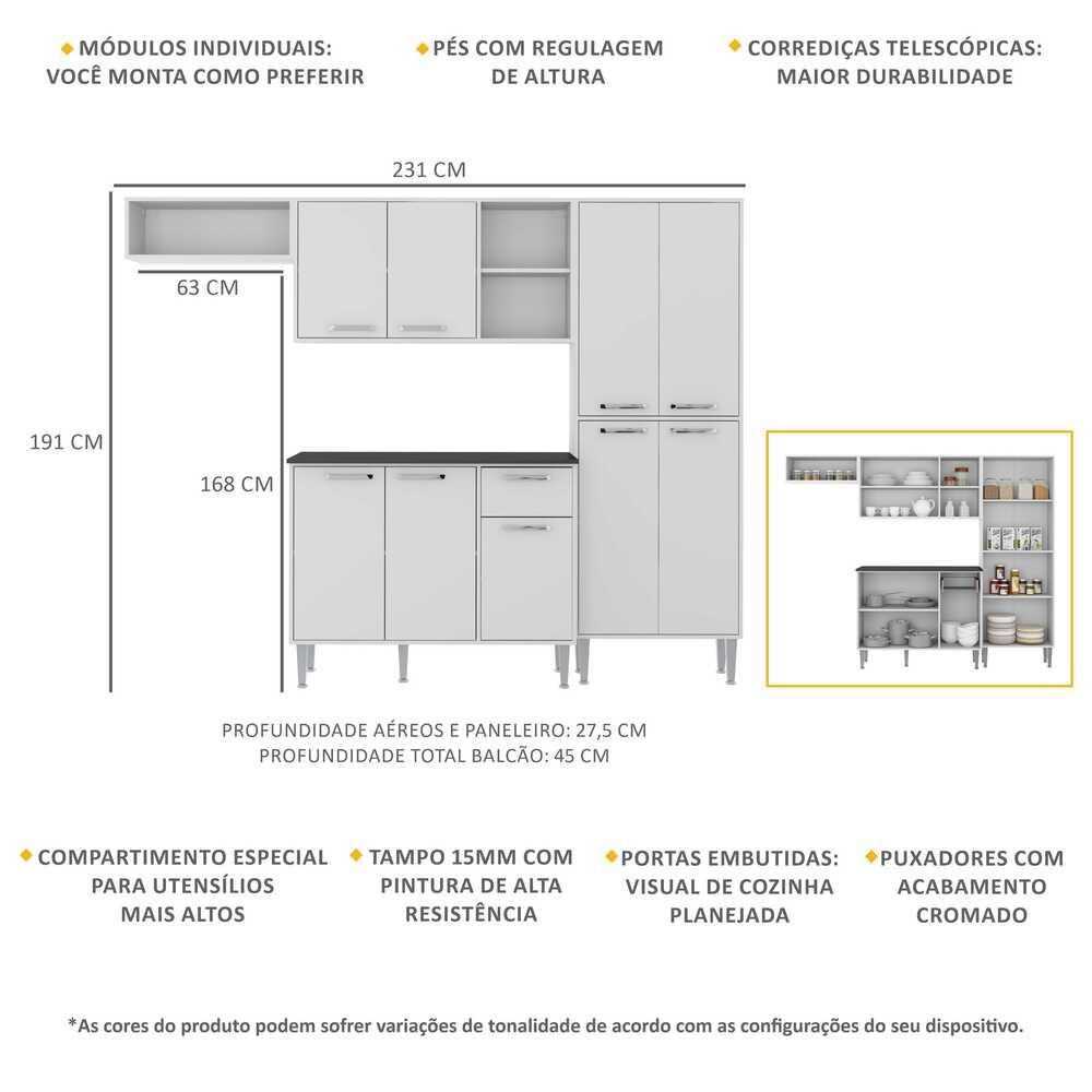 A Cozinha Completa Compacta com Armário e Balcão com Tampo 4 pçs Xangai Multimóveis tem um excelente custo benefício e um amplo espaço interno. Os módulos são individuais e você pode montar da maneira que se adaptar melhor ao seu ambiente. Produzida em MDP com acabamento acetinado (cerca de 20% de brilho), que garante maior durabilidade, resistência e facilidade na limpeza, conta com corrediças telescópicas em aço (maior durabilidade e travas de segurança para evitar acidentes), pés com regulagem de altura (permitem um perfeito nivelamento dos módulos), puxadores em ABS com acabamento cromado e tampo em MDP 15mm com pintura de alta resistência. O balcão possui tampo removível (compatível apenas com pia sob medida). Para deixar sua cozinha mais bonita e organizada, possui compartimento especial para utensílios mais altos e portas embutidas que proporcionam um visual de cozinha planejada. Conteúdo da Embalagem: 1 (um) nicho horizontal 1 (um) armário aéreo de 105cm 1 (um) paneleiro duplo 1 (um) balcão com tampo de 105cm Dimensões do produto montado: Cozinha: Altura: 191cm | Largura: 231cm | Profundidade: 27,5cm (aéreos e paneleiro) - 45cm (balcão com tampo) Espaço do nicho para fogão/geladeira: Altura: 168cm - Largura: 63cm *Você pode consultar as medidas internas na imagem técnica do produto. Disponível nas cores: Branco - Branco/Preto Acetinado Texturizado - Branco/Lacca Fumê Alto Brilho - Madeirado - Madeirado/Branco - Preto Acetinado Texturizado - Madeirado/Preto Acetinado Texturizado *As cores do produto podem sofrer variações de tonalidade de acordo com as configurações do seu dispositivo. Imagem meramente ilustrativa. Decoração e eletros não acompanham o produto. O produto será entregue desmontado e não disponibilizamos o serviço de montagem..