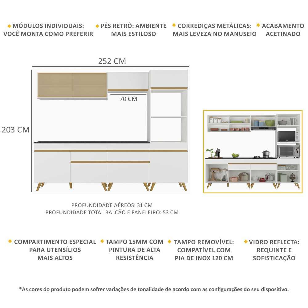 A Cozinha Completa 5 peças com Armário e Balcão MP3715 Veneza Multimóveis tem um excelente custo benefício e um amplo espaço interno. Produzida em MDP com acabamento acetinado (cerca de 20% de brilho), que garante maior durabilidade e resistência, possui corrediças metálicas (mais leveza no manuseio), pés retrô em polipropileno, que deixam o ambiente mais estiloso, puxadores em ABS e tampo em MDP 15mm com pintura de alta resistência. Os módulos são individuais e você pode montar da maneira que se adaptar melhor ao seu ambiente. O balcão possui tampo removível (compatível com pia de 120 cm). Para deixar sua cozinha mais bonita e completa possui vidro reflecta, compartimento especial para utensílios mais altos, balcão para cooktop, além de espaço para forno e microondas. Conteúdo da Embalagem: 1 (um) Armário aéreo 120cm 1 (um) Balcão com tampo 120cm 1 (um) Armário aéreo 70cm 1 (um) Balcão com tampo 70cmcm 1 (um) Paneleiro 62cm Dimensões do produto montado: Altura: 203cm | Largura: 252cm | Profundidade: 31cm (aéreos) - 53cm (paneleiro e balcão com tampo) *Você pode consultar as medidas detalhadas na imagem técnica do produto. *As cores do produto podem sofrer variações de tonalidade de acordo com as configurações do seu dispositivo. Imagem meramente ilustrativa. Decoração e eletros não acompanham o produto. O produto será entregue desmontado e não disponibilizamos o serviço de montagem..
