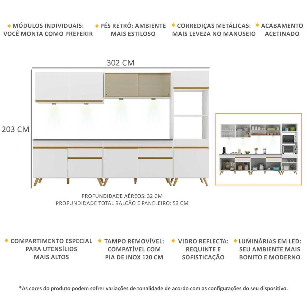 A Cozinha Completa 5 peças com Leds MP2014 Veneza Up Multimóveis tem um excelente custo benefício e um amplo espaço interno. Produzida em MDP com acabamento acetinado (cerca de 20% de brilho), que garante maior durabilidade e resistência, possui corrediças metálicas (mais leveza no manuseio), pés retrô em polipropileno, que deixam o ambiente mais estiloso, puxadores em ABS e tampo em MDP 15mm com pintura de alta resistência. Os módulos são individuais e você pode montar da maneira que se adaptar melhor ao seu ambiente. O balcão possui tampo removível (compatível com pia de 120 cm). Para deixar sua cozinha mais bonita e organizada, possui módulo para forno e microndas, além de vidro reflecta e compartimento especial para utensílios mais altos. As luminárias em LED, que acompanham a cozinha, proporcionam um visual mais bonito e moderno, deixando o ambiente aconchegante e confortável. Com design minimalista e de fácil instalação, você pode escolher em qual lugar do móvel deseja fixar. Com luz brilhante, as luminárias funcionam com 3 pilhas AAA. Conteúdo da Embalagem: 1 (um) Armário aéreo 120cm 1 (um) Armário aéreo com portas de vidro 120cm 2 (dois) Balcões com tampo 120cm 1 (um) Armário para forno e microondas 62cm 1 (um) Kit com 4 Luminárias LED Kit Ferragem Manual de Montagem Dimensões do produto montado: Altura: 203cm | Largura: 302cm | Profundidade: 32cm (aéreos) - 53cm (paneleiro e balcão com tampo) *Você pode consultar as medidas detalhadas na imagem técnica do produto. *As cores do produto podem sofrer variações de tonalidade de acordo com as configurações do seu dispositivo. Imagem meramente ilustrativa. Decoração e eletros não acompanham o produto. O produto será entregue desmontado e não disponibilizamos o serviço de montagem..