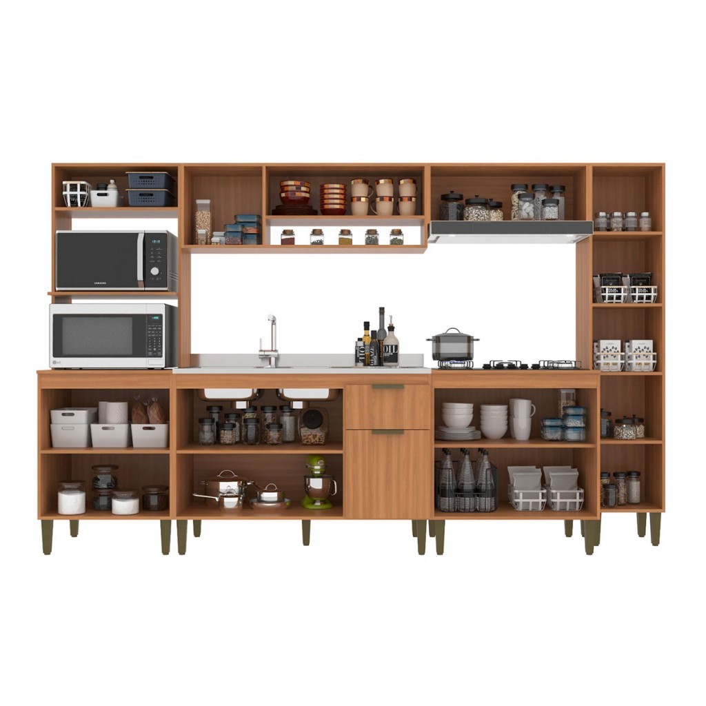 Descrição: O(a) Cozinha Completa Alana 12 Portas 1 Gaveta Freijó/Off White - Jcarvalho é produzido em MDP na escala de brilho Fosco, e possui um grau de dificuldade de montagem: Médio.Seu revestimento/acabamento é: Finish Foil. Infelizmente a Loja não oferece serviço de montagem, deixamos essa informação bem clara em todas as nossas páginas de produto. Onde especificamos que os móveis chegarão desmontados, e que a montagem fica por conta do cliente. Como não oferecemos esse serviço não embutimos o mesmo no preço dos produtos, ou seja, maior economia para você! Todos os nossos móveis também acompanham o manual de montagem, e caso você queira, pode realizar a montagem você mesmo, sempre especificamos os graus de montagem dos produtos. Nos casos de grau baixo e médio, com pouco ou nenhum conhecimento, você mesmo pode efetuar a montagem, e fazer essa economia. Apenas nos graus de montagem alto, recomendamos a contratação de um montador com experiência, visto que são montagens mais complicadas. A montagem é feita com Parafusos, cavilhas e Minifix.. Este móvel é indicado para que seja utilizado no(a) Cozinha, dando um toque especial no cômodo de sua casa. Para que você mantenha seu produto sempre em ótimo estado, recomendamos que use apenas um pano seco ou levemente umedecido, sem o uso de quaisquer produtos abrasivos. A Loja garante aos clientes, 90 dias de garantia nos produtos, porém, recomendamos que entre em contato com o fornecedor/marca do produto, pois o mesmo(a), pode garantir um prazo maior de garantia. Lembrando ainda que: quaisquer objetos decorativos que aparecem nas imagens, não acompanham o produto. Características: - Material da Estrutura: MDP - Necessita de Montagem: Sim - Como os Móveis Chegarão na Minha Casa: Desmontado em caixas, acompanhado de todas as peças, ferragens e manuais para montagem. - Grau de Dificuldade da Montagem: Médio - Sistema de Montagem: Parafusos, cavilhas e Minifix. - Observação: Objetos decorativos que aparecem nas imagens, não acompanham o produto. - Recomendação de Manutenção: Utilizar pano levemente umedecido, seguido de pano seco. Não utilizar quaisquer produtos abrasivos. - Indicação de Uso: Cozinha - Garantia (dias): 90 - Escala de Brilho: Fosco - Pés com regulagem de altura?: Sim - Acompanha: Cozinha Completa, Kit Ferragens, Manual de Montagem - Quantidade de Pés/Sapatas: 17 - Acompanha Pia: Não - Possui Vidro: Não - Cozinha Suspensa: Não - Espaço Para Micro-ondas: Sim - Espaço Para Forno: Sim - Revestimento /Acabamento: Finish Foil - Medidas Espaço Forno (A x L x P): 38,8 x 67 x 52 cm - Tamanho Pia Indicado (LXP): 120 x 53 cm - Tampo ''Cooktop'': Não Apresenta Furação/Marcação para Cooktop - Quantidade de Portas: 12 - Tipo de Porta: Portas de Bater e Portas Basculantes - Quantidade de Gavetas: 1 - Peso Suportado nas Gavetas (Kg): 5 Kg - Material das Corrediças: Metálica - Material das Dobradiças: Metálica - Material do Puxador: Plástico - Espessura da Estrutura: 15mm - Tipo da Corrediça: Convencional - Material da Porta: MDP - Espessura da Porta: 15 mm - Quantidade de Prateleiras: 7 - Peso Suportado nas Prateleiras:: 5 Kg - Linha ou Coleção: 2025. - Tipo de Móveis de Cozinha: Armário Balcão - Montagem Invertida?: Pode ser Montado de Ambos os Lados - Material dos Pés: Plástico - Quantidade de Nichos: 1 - Material do Nicho: MDP - Peso Suportado no Nicho (Kg): 5 Kg - Medidas Espaço Microondas (A x L x P): 41,5 x 67 x 52 cm - Possui Rodízios?: Não - Possui Espelho?: Não - Possui Vidro?: Não - Possui Gavetas?: Sim - Possui Portas?: Sim - Possui Prateleiras?: Sim - Possui Puxadores?: Sim - Possui Espaço para Pia?: Sim - Possui Pés?: Sim - É frágil?: Não - Possui Ripamento?: Não - Acompanha Manual de Montagem: Sim - Possui Nicho?: Sim - Acompanha Tampo para Cooktop: Sim - Acompanha Tampo para Pia?: Não