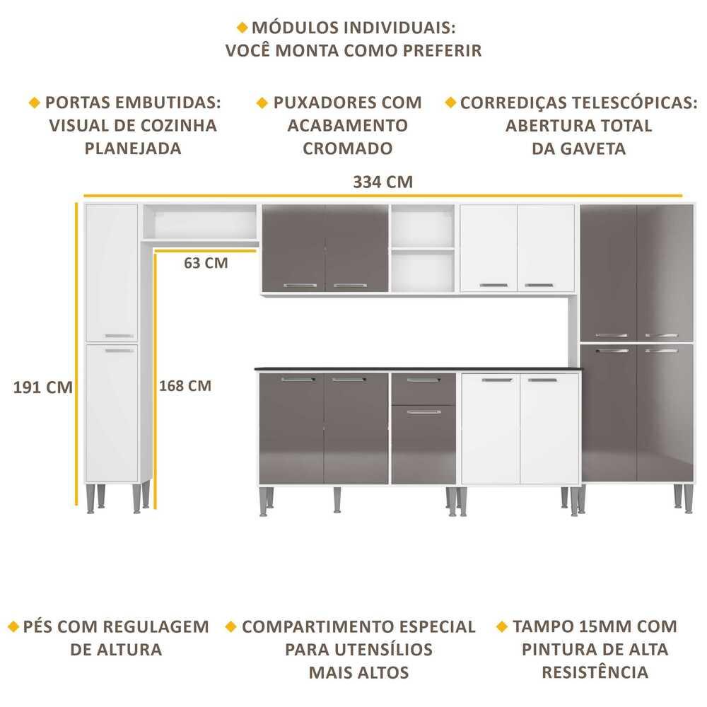 A Cozinha Completa Compacta com Armário e Balcão com Tampo 7 peças Xangai Blues Multimóveis tem um excelente custo benefício e um amplo espaço interno. Os módulos são individuais e você pode montar da maneira que se adaptar melhor ao seu ambiente. Produzida em MDP, que garante maior durabilidade e resistência, conta com corrediças telescópicas em aço (maior durabilidade e travas de segurança para evitar acidentes), pés com regulagem de altura (permitem um perfeito nivelamento dos módulos), puxadores em ABS com acabamento cromado e tampos em MDP 15mm com pintura de alta resistência. Para deixar sua cozinha mais bonita e organizada, possui compartimento especial para utensílios mais altos e módulo aéreo com nichos. As portas embutidas proporcionam um visual de cozinha planejada. Conteúdo da Embalagem: 1 (um) nicho horizontal 1 (um) armário aéreo de 105 cm 1 (um) paneleiro duplo 1 (um) balcão com tampo de 105 cm 1 (um) paneleiro simples 1 (um) balcão com tampo de 70 cm 1 (um) armário aéreo de 70 cm Dimensões do produto montado: Cozinha: Altura: 191 cm - Largura: 334 cm - Profundidade: 27,5 cm (aéreos e paneleiro) - 45 cm (balcão com tampo) Espaço do nicho para fogão/geladeira: Altura: 168 cm - Largura: 63 cm *Você pode consultar as medidas internas na imagem técnica do produto. Disponível em 3 opções de cores: Branco Acetinado - Branco Acetinado/Preto Acetinado Texturizado - Branco Acetinado/Lacca Fumê Alto Brilho *As cores do produto podem sofrer variações de tonalidade de acordo com as configurações do seu dispositivo. Imagem meramente ilustrativa. Decoração e eletros não acompanham o produto. O produto será entregue desmontado e não disponibilizamos o serviço de montagem..