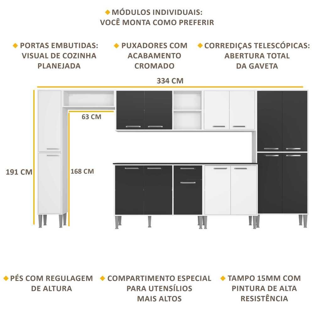 A Cozinha Completa Compacta com Armário e Balcão com Tampo 7 peças Xangai Blues Multimóveis tem um excelente custo benefício e um amplo espaço interno. Os módulos são individuais e você pode montar da maneira que se adaptar melhor ao seu ambiente. Produzida em MDP, que garante maior durabilidade e resistência, conta com corrediças telescópicas em aço (maior durabilidade e travas de segurança para evitar acidentes), pés com regulagem de altura (permitem um perfeito nivelamento dos módulos), puxadores em ABS com acabamento cromado e tampos em MDP 15mm com pintura de alta resistência. Para deixar sua cozinha mais bonita e organizada, possui compartimento especial para utensílios mais altos e módulo aéreo com nichos. As portas embutidas proporcionam um visual de cozinha planejada. Conteúdo da Embalagem: 1 (um) nicho horizontal 1 (um) armário aéreo de 105 cm 1 (um) paneleiro duplo 1 (um) balcão com tampo de 105 cm 1 (um) paneleiro simples 1 (um) balcão com tampo de 70 cm 1 (um) armário aéreo de 70 cm Dimensões do produto montado: Cozinha: Altura: 191 cm - Largura: 334 cm - Profundidade: 27,5 cm (aéreos e paneleiro) - 45 cm (balcão com tampo) Espaço do nicho para fogão/geladeira: Altura: 168 cm - Largura: 63 cm *Você pode consultar as medidas internas na imagem técnica do produto. Disponível em 3 opções de cores: Branco Acetinado - Branco Acetinado/Preto Acetinado Texturizado - Branco Acetinado/Lacca Fumê Alto Brilho *As cores do produto podem sofrer variações de tonalidade de acordo com as configurações do seu dispositivo. Imagem meramente ilustrativa. Decoração e eletros não acompanham o produto. O produto será entregue desmontado e não disponibilizamos o serviço de montagem..