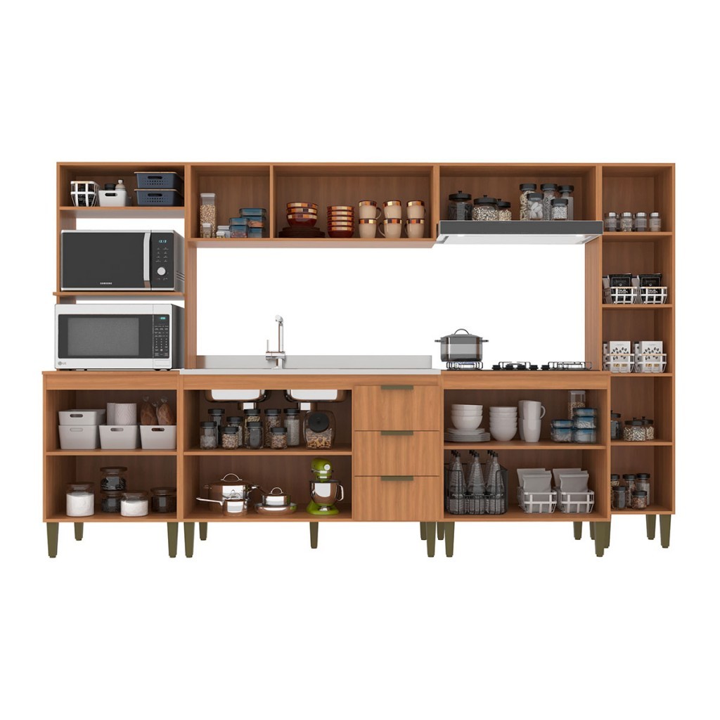 Descrição: O(a) Cozinha Completa Bia 12 Portas 3 Gavetas Freijó/Off White - Jcarvalho é produzido em MDP na escala de brilho Fosco, e possui um grau de dificuldade de montagem: Médio.Seu revestimento/acabamento é: Finish Foil. Infelizmente a Loja não oferece serviço de montagem, deixamos essa informação bem clara em todas as nossas páginas de produto. Onde especificamos que os móveis chegarão desmontados, e que a montagem fica por conta do cliente. Como não oferecemos esse serviço não embutimos o mesmo no preço dos produtos, ou seja, maior economia para você! Todos os nossos móveis também acompanham o manual de montagem, e caso você queira, pode realizar a montagem você mesmo, sempre especificamos os graus de montagem dos produtos. Nos casos de grau baixo e médio, com pouco ou nenhum conhecimento, você mesmo pode efetuar a montagem, e fazer essa economia. Apenas nos graus de montagem alto, recomendamos a contratação de um montador com experiência, visto que são montagens mais complicadas. A montagem é feita com Parafusos, cavilhas e Minifix.. Este móvel é indicado para que seja utilizado no(a) Cozinha, dando um toque especial no cômodo de sua casa. Para que você mantenha seu produto sempre em ótimo estado, recomendamos que use apenas um pano seco ou levemente umedecido, sem o uso de quaisquer produtos abrasivos. A Loja garante aos clientes, 90 dias de garantia nos produtos, porém, recomendamos que entre em contato com o fornecedor/marca do produto, pois o mesmo(a), pode garantir um prazo maior de garantia. Lembrando ainda que: quaisquer objetos decorativos que aparecem nas imagens, não acompanham o produto. Características: - Material da Estrutura: MDP - Necessita de Montagem: Sim - Como os Móveis Chegarão na Minha Casa: Desmontado em caixas, acompanhado de todas as peças, ferragens e manuais para montagem. - Grau de Dificuldade da Montagem: Médio - Sistema de Montagem: Parafusos, cavilhas e Minifix. - Observação: Objetos decorativos que aparecem nas imagens, não acompanham o produto. - Recomendação de Manutenção: Utilizar pano levemente umedecido, seguido de pano seco. Não utilizar quaisquer produtos abrasivos. - Indicação de Uso: Cozinha - Garantia (dias): 90 - Escala de Brilho: Fosco - Pés com regulagem de altura?: Sim - Acompanha: Cozinha Completa, Kit Ferragens, Manual de Montagem - Quantidade de Pés/Sapatas: 17 - Acompanha Pia: Não - Possui Vidro: Não - Cozinha Suspensa: Não - Espaço Para Micro-ondas: Sim - Espaço Para Forno: Sim - Revestimento /Acabamento: Finish Foil - Medidas Espaço Forno (A x L x P): 38,8 x 67 x 52 cm - Medidas Espaço Microondas (A x L x P): 41,5 x 67 x 52 cm - Tamanho Pia Indicado (LXP): 120 x 53 cm - Possui Rodízios?: Não - Tampo ''Cooktop'': Não Apresenta Furação/Marcação para Cooktop - Quantidade de Portas: 12 - Tipo de Porta: Portas de Bater e Portas Basculantes - Quantidade de Gavetas: 3 - Possui Espelho?: Não - Possui Vidro?: Não - Peso Suportado nas Gavetas (Kg): 5 Kg - Material das Corrediças: Metálica - Material das Dobradiças: Metálica - Material do Puxador: Plástico - Espessura da Estrutura: 15mm - Possui Gavetas?: Sim - Tipo da Corrediça: Convencional - Possui Portas?: Sim - Material da Porta: MDP - Espessura da Porta: 15 mm - Possui Prateleiras?: Sim - Quantidade de Prateleiras: 7 - Peso Suportado nas Prateleiras:: 5 Kg - Possui Puxadores?: Sim - Possui Espaço para Pia?: Sim - Linha ou Coleção: 2025. - Tipo de Móveis de Cozinha: Armário Balcão - Possui Pés?: Sim - É frágil?: Não - Possui Ripamento?: Não - Montagem Invertida?: Pode ser Montado de Ambos os Lados - Material dos Pés: Plástico - Acompanha Manual de Montagem: Sim - Possui Nicho?: Não - Acompanha Tampo para Cooktop: Sim - Acompanha Tampo para Pia?: Não