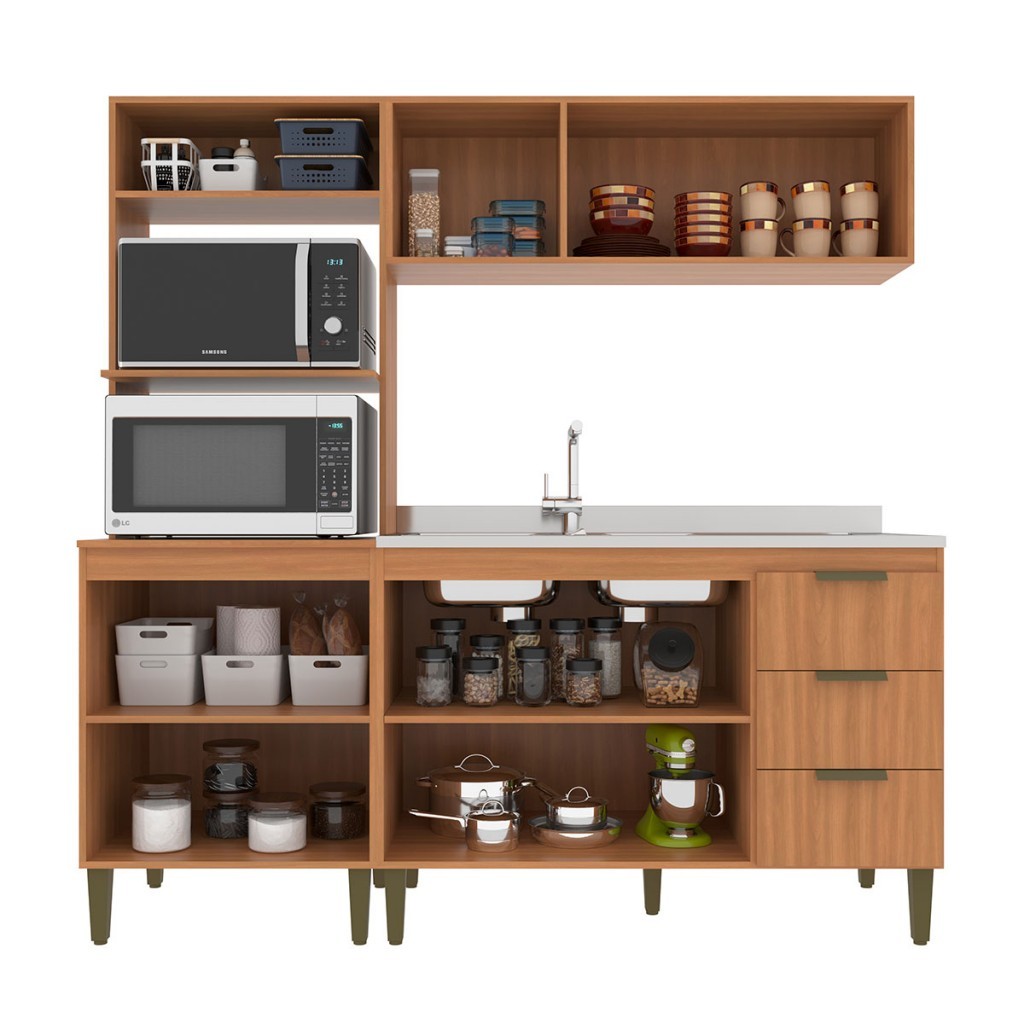Dimensões: - Altura: 193,00 cm - Largura: 183,00 cm - Profundidade: 53,00 cm - Peso: 81,890 kg Descrição: O(a) Cozinha Completa Bia 8 Portas 3 Gavetas Freijó/Off White - Jcarvalho é produzido em MDP na escala de brilho Fosco, e possui um grau de dificuldade de montagem: Médio. Seu revestimento/acabamento é: Finish Foil. Infelizmente a Loja não oferece serviço de montagem, deixamos essa informação bem clara em todas as nossas páginas de produto. Onde especificamos que os móveis chegarão desmontados, e que a montagem fica por conta do cliente. Como não oferecemos esse serviço não embutimos o mesmo no preço dos produtos, ou seja, maior economia para você! Todos os nossos móveis também acompanham o manual de montagem, e caso você queira, pode realizar a montagem você mesmo, sempre especificamos os graus de montagem dos produtos. Nos casos de grau baixo e médio, com pouco ou nenhum conhecimento, você mesmo pode efetuar a montagem, e fazer essa economia. Apenas nos graus de montagem alto, recomendamos a contratação de um montador com experiência, visto que são montagens mais complicadas. A montagem é feita com Parafusos, cavilhas e Minifix.. Este móvel é indicado para que seja utilizado no(a) Cozinha, dando um toque especial no cômodo de sua casa. Para que você mantenha seu produto sempre em ótimo estado, recomendamos que use apenas um pano seco ou levemente umedecido, sem o uso de quaisquer produtos abrasivos. A Loja garante aos clientes, 90 dias de garantia nos produtos, porém, recomendamos que entre em contato com o fornecedor/marca do produto, pois o mesmo(a), pode garantir um prazo maior de garantia. Lembrando ainda que: quaisquer objetos decorativos que aparecem nas imagens, não acompanham o produto. Características: - Espessura da Estrutura: 15mm - Possui Gavetas?: Sim - Quantidade de Gavetas: 3 - Peso Suportado nas Gavetas (Kg): 5 Kg - Material das Corrediças: Metálica - Tipo da Corrediça: Convencional - Possui Portas?: Sim - Quantidade de Portas: 8 - Material da Porta: MDP - Espessura da Porta: 15 mm - Tipo de Porta: Portas de Bater e Portas Basculantes - Material das Dobradiças: Metálica - Possui Vidro?: Não - Possui Espelho?: Não - Possui Prateleiras?: Sim - Quantidade de Prateleiras: 2 - Peso Suportado nas Prateleiras:: 5 Kg - Possui Puxadores?: Sim - Material do Puxador: Plástico - Possui Ripamento?: Não - Linha ou Coleção: 2025. - Montagem Invertida?: Pode ser Montado de Ambos os Lados - Cor interna: Bege Claro - É frágil?: Não - Possui distanciador de corrediça?: Não - Possui Nicho?: Não - Acompanha Tampo para Cooktop: Não - Material da Estrutura: MDP - Escala de Brilho: Fosco - Acompanha Tampo para Pia?: Não - Possui Espaço para Pia?: Sim - Possui Rodízios?: Não - Acompanha Pia?: Não - Tamanho Pia Indicado (LXP): 120 x 53 cm - Possui Pés?: Sim - Pés com regulagem de altura?: Sim - Quantidade de Pés/Sapatas: 9 - Espaço Para Forno: Sim - Espaço Para Micro-ondas: Sim - Medidas Espaço Forno (A x L x P): 38,8 x 67 x 52 cm - Medidas Espaço Microondas (A x L x P): 41,5 x 67 x 52 cm - Possui Vidro: Não - Material dos Pés: Plástico - Cozinha Suspensa: Não - Tipo de Móveis de Cozinha: Armário Balcão - Acompanha: Cozinha Completa, Kit Ferragens, Manual de Montagem - Acompanha Manual de Montagem: Sim - Como os Móveis Chegarão na Minha Casa: Desmontado em caixas, acompanhado de todas as peças, ferragens e manuais para montagem. - Grau de Dificuldade da Montagem: Médio - Necessita de Montagem: Sim - Sistema de Montagem: Parafusos, cavilhas e Minifix. - Garantia (dias): 90 - Indicação de Uso: Cozinha - Observação: Objetos decorativos que aparecem nas imagens, não acompanham o produto. - Recomendação de Manutenção: Utilizar pano levemente umedecido, seguido de pano seco. Não utilizar quaisquer produtos abrasivos. - Revestimento /Acabamento: Finish Foil