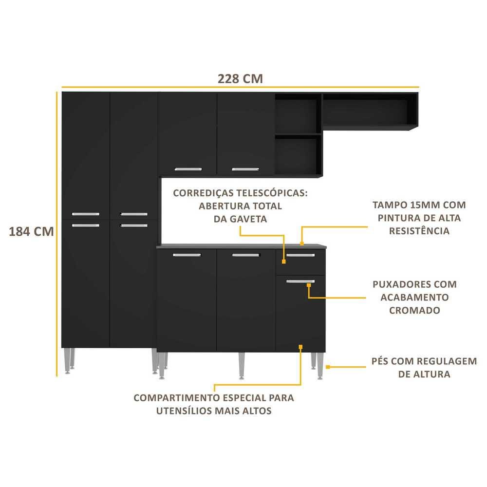 A Cozinha Completa Compacta com Armário e Balcão com Tampo Lisboa Multimóveis tem um excelente custo benefício e um amplo espaço interno. Os módulos são individuais e você pode montar da maneira que se adaptar melhor ao seu ambiente (exceto o nicho para fogão/geladeira que é anexo ao armário aéreo). O paneleiro pode ser montado de forma suspensa, o que permite você ajustar a altura para encaixar a geladeira. Produzida em MDP, que garante maior durabilidade e resistência, possui corrediças metálicas (mais leveza no manuseio), pés com regulagem de altura (permitem um perfeito nivelamento dos módulos), puxadores em ABS com acabamento cromado e tampos em MDP 15mm com pintura de alta resistência. Para deixar sua cozinha mais bonita e organizada, possui compartimento especial para utensílios mais altos e módulo aéreo com nichos. Conteúdo da Embalagem: 1 (um) armário aéreo com nicho lateral e horizontal de 166 cm 1 (um) paneleiro duplo de 62 cm 1 (um) balcão com tampo de 105 cm Dimensões do produto montado: Cozinha: Altura: 184 cm - Largura: 228 cm - Profundidade: 27 cm (aéreos e paneleiro) - 44,5 cm (balcão com tampo) Espaço do nicho para fogão/geladeira: Altura: 162 cm - Largura: 61 cm *Você pode consultar as medidas internas na imagem técnica do produto. Disponível em 3 opções de cores: Carvalho Avelã Acetinado Texturizado - Carvalho Avelã Acet. Text./Preto Acet. Text. - Preto Acetinado Texturizado *As cores do produto podem sofrer variações de tonalidade de acordo com as configurações do seu dispositivo. Imagem meramente ilustrativa. Decoração e eletros não acompanham o produto. O produto será entregue desmontado e não disponibilizamos o serviço de montagem..