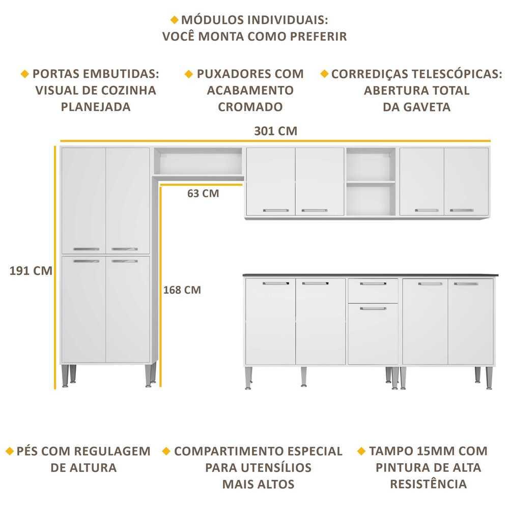 A Cozinha Completa Compacta com Armário e Balcão com Tampo 6 peças Xangai Jazz Multimóveis tem um excelente custo benefício e um amplo espaço interno. Os módulos são individuais e você pode montar da maneira que se adaptar melhor ao seu ambiente. Produzida em MDP, que garante maior durabilidade e resistência, conta com corrediças telescópicas em aço (maior durabilidade e travas de segurança para evitar acidentes), pés com regulagem de altura (permitem um perfeito nivelamento dos módulos), puxadores em ABS com acabamento cromado e tampos em MDP 15mm com pintura de alta resistência. Para deixar sua cozinha mais bonita e organizada, possui compartimento especial para utensílios mais altos e módulo aéreo com nichos. As portas embutidas proporcionam um visual de cozinha planejada. Conteúdo da Embalagem: 1 (um) nicho horizontal 1 (um) armário aéreo de 105 cm 1 (um) paneleiro duplo 1 (um) balcão com tampo de 105 cm 1 (um) balcão com tampo de 70 cm 1 (um) armário aéreo de 70 cm Dimensões do produto montado: Cozinha: Altura: 191 cm - Largura: 301 cm - Profundidade: 27,5 cm (aéreos e paneleiro) - 45 cm (balcão com tampo) Espaço do nicho para fogão/geladeira: Altura: 168 cm - Largura: 63 cm *Você pode consultar as medidas internas na imagem técnica do produto. Disponível em 3 opções de cores: Branco Acetinado - Branco Acetinado/Preto Acetinado Texturizado - Branco Acetinado/Lacca Fumê Alto Brilho *As cores do produto podem sofrer variações de tonalidade de acordo com as configurações do seu dispositivo. Imagem meramente ilustrativa. Decoração e eletros não acompanham o produto. O produto será entregue desmontado e não disponibilizamos o serviço de montagem..