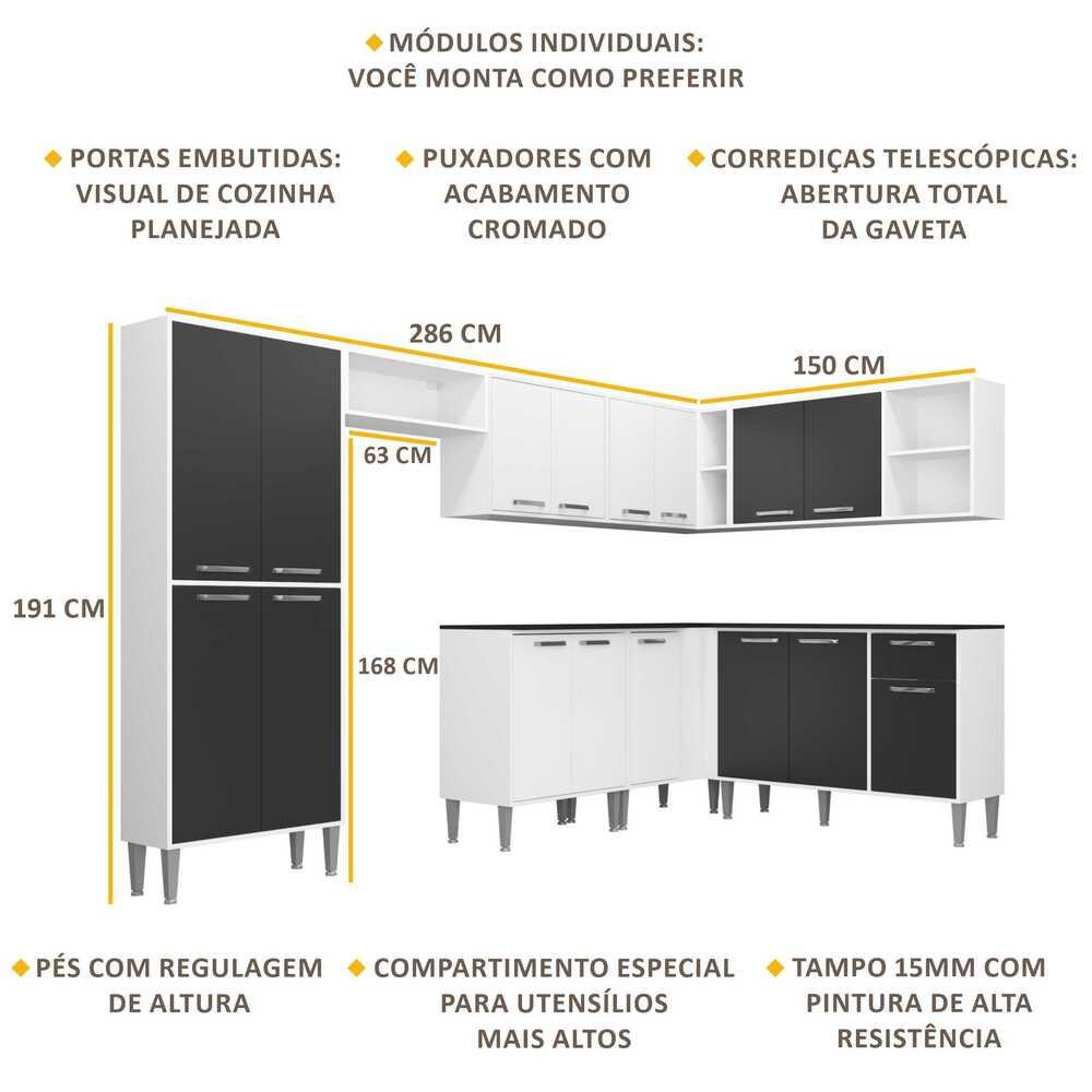 A Cozinha Completa Xangai Soul com Armário e Balcão com Tampo 8 peças Multimóveis tem um excelente custo benefício e um amplo espaço interno. Os módulos são individuais e você pode montar da maneira que se adaptar melhor ao seu ambiente. Produzida em MDP, que garante maior durabilidade e resistência, conta com corrediças telescópicas em aço (maior durabilidade e travas de segurança para evitar acidentes), pés com regulagem de altura (permitem um perfeito nivelamento dos módulos), puxadores em ABS com acabamento cromado e tampos em MDP 15mm com pintura de alta resistência. Para deixar sua cozinha mais bonita e organizada, possui compartimento especial para utensílios mais altos e módulo aéreo com nichos. As portas embutidas proporcionam um visual de cozinha planejada. Conteúdo da Embalagem: 1 (um) nicho horizontal 1 (um) armário aéreo de 105 cm 1 (um) paneleiro duplo 1 (um) balcão com tampo de 105 cm 1 (um) balcão com tampo de canto 1 (um) armário aéreo de canto 1 (um) balcão com tampo de 70 cm 1 (um) armário aéreo de 70 cm Dimensões do produto montado: Cozinha: Altura: 191 cm - Largura: 286 x 150 cm - Profundidade: 27,5 cm (aéreos e paneleiro) - 45 cm (balcão com tampo) Espaço do nicho para fogão/geladeira: Altura: 168 cm - Largura: 63 cm *Você pode consultar as medidas internas na imagem técnica do produto. Disponível em 3 opções de cores: Branco Acetinado - Branco Acetinado/Preto Acetinado Texturizado - Branco Acetinado/Lacca Fumê Alto Brilho *As cores do produto podem sofrer variações de tonalidade de acordo com as configurações do seu dispositivo. Imagem meramente ilustrativa. Decoração e eletros não acompanham o produto. O produto será entregue desmontado e não disponibilizamos o serviço de montagem..