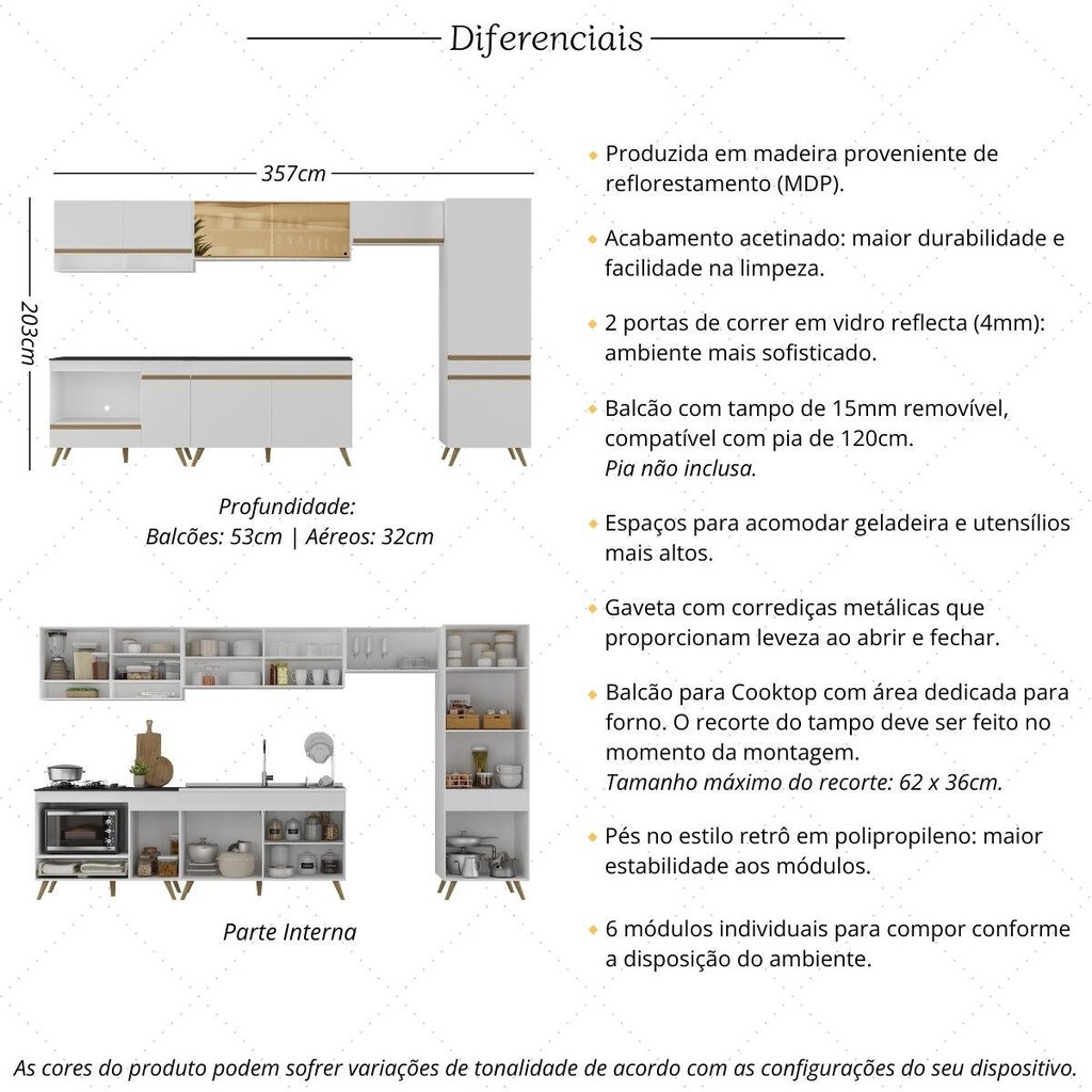 O Armário de Cozinha Modulada Completa 6 Peças com Balcão para Cooktop Veneza Multimóveis é o conjunto perfeito para um ambiente moderno e funcional, remetendo a uma cozinha planejada. Produzido em madeira de reflorestamento (MDP) com acabamento acetinado (cerca de 20% de brilho), garante alta durabilidade e resistência. Aproveite cada canto disponível com seus 6 módulos individuais que se adaptam ao espaço do ambiente. Versatilidade: O balcão com tampo (15mm) recortável é compatível com Cooktop de 4 ou 5 bocas e possui nicho para acomodar o seu forno, otimizando o espaço da cozinha. O recorte do tampo deve ser feito no momento da montagem, conforme o tamanho do seu Cooktop (tamanho máximo do nicho: 62 x 36cm). A cozinha também inclui balcão com tampo removível, compatível com pia de 120cm. Cooktop e pia não inclusos. Organização impecável: São 10 portas, sendo 1 basculante com pistão a gás e 2 de correr em vidro reflecta, proporcionando máxima segurança e praticidade no manuseio. A gaveta com corrediças metálicas oferece uma abertura suave e permite acomodar acessórios menores. Ainda, o conjunto conta com áreas para organizar utensílios mais altos e nichos versáteis para colocação de temperos, proporcionando um amplo espaço de armazenamento. Estabilidade e estilo: Pés no estilo retrô em polipropileno elegantes que proporcionam estabilidade, além de puxadores modernos em ABS para dar o toque final ao ambiente. BRINDE EXCLUSIVO: Jogo de Panelas Tramontina Turim com 5 Peças Na compra da sua cozinha, você ganha um lindo jogo de panelas antiaderente Tramontina Turim (5 peças). Produzidas em alumínio com revestimento interno e externo em Starflon Max, garantem cozimento rápido, fácil limpeza e mais saúde para sua família! Conteúdo da Embalagem: 1 (um) Balcão para Cooktop com Tampo 105cm 1 (um) Balcão para Pia com Tampo 120cm 1 (um) Armário de Cozinha Aéreo 105cm 1 (um) Armário de Cozinha Aéreo 120cm 1 (um) Armário de Cozinha Aéreo 70cm 1 (um) Paneleiro Cozinha 62cm 1 (um) Jogo de Panelas Tramontina Turim 5 Peças Kit Ferragem Manual de Montagem Especificações Técnicas: Dimensões do Produto Montado - Altura: 203cm | Largura: 357cm | Profundidade: 53cm (Balcão) - 32cm (Armário) Espaço para Forno - Altura: 39cm | Largura: 66cm | Profundidade: 49,5cm Espaço para Fogão/Geladeira - Altura: 170cm | Largura: 70cm Material: MDP Acabamento: Acetinado Espessura do Tampo: 15mm Puxadores: ABS Pés: Polipropileno Corrediças: Metálicas Balcão para Cooktop 4 ou 5 Bocas: Sim Nicho para Forno: Sim Balcão Compatível com Pia: Sim *Você pode consultar as medidas detalhadas na imagem técnica do produto. *As cores do produto podem sofrer variações de tonalidade de acordo com as configurações do seu dispositivo. Aqui na Loja Multimóveis, você pode concluir sua compra facilmente com toda segurança. A entrega é garantida e aqui você está em 1° lugar. Imagem meramente ilustrativa. Decoração, pia e eletros não acompanham o produto. O produto será entregue desmontado e não disponibilizamos o serviço de montagem.
