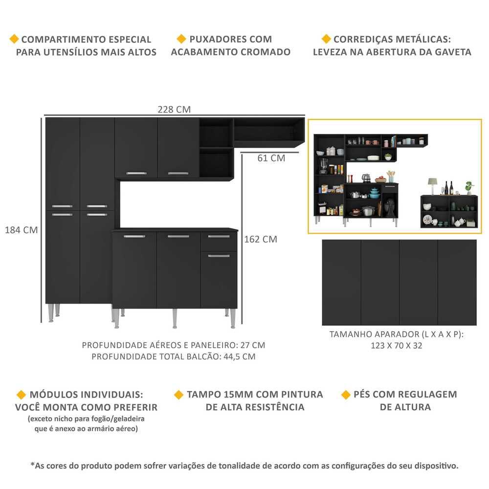 A Cozinha Completa com Buffet/Aparador Paris Multimóveis MP2043 tem um excelente custo benefício e um amplo espaço interno. Os módulos são individuais (exceto o nicho para fogão/geladeira que é anexo ao armário aéreo) e você pode montar da maneira que se adaptar melhor ao seu ambiente. Produzida em MDP com acabamento acetinado (cerca de 20% de brilho), que garante maior durabilidade e resistência, possui corrediças metálicas (mais leveza no manuseio), pés com regulagem de altura de 17 a 20cm (permitem um perfeito nivelamento dos módulos), puxadores em ABS com acabamento cromado e tampos em MDP 15mm com pintura de alta resistência. O balcão possui tampo removível (compatível apenas com pia sob medida). Para deixar sua cozinha mais bonita e organizada, possui compartimento especial para utensílios mais altos e módulo aéreo com nichos. Acompanha, ainda, um buffet/aparador com 4 portas para deixar sua casa mais bonita e completa. O design clean permite que ele seja utilizado em qualquer ambiente. Conteúdo da Embalagem: 1 (um) armário aéreo com nicho lateral e horizontal de 166cm 1 (um) paneleiro duplo de 62cm 1 (um) balcão com tampo de 105cm 1 (um) buffet/aparador 4 portas Dimensões do produto montado: Cozinha - Altura: 184cm - Largura: 228cm - Profundidade: 27cm (aéreos e paneleiro) - 44,5cm (balcão com tampo) Espaço do nicho para fogão/geladeira - Altura: 162cm - Largura: 61cm Aparador - Altura: 70cm | Largura: 123cm | Profundidade: 32cm *Você pode consultar as medidas internas na imagem técnica do produto. Disponível nas cores: Preto Acetinado Texturizado - Madeirado/Preto Acetinado Texturizado - Preto Acetinado Texturizado/Lacca Fumê Brilho *As cores do produto podem sofrer variações de tonalidade de acordo com as configurações do seu dispositivo. Imagem meramente ilustrativa. Decoração e eletros não acompanham o produto. O produto será entregue desmontado e não disponibilizamos o serviço de montagem..