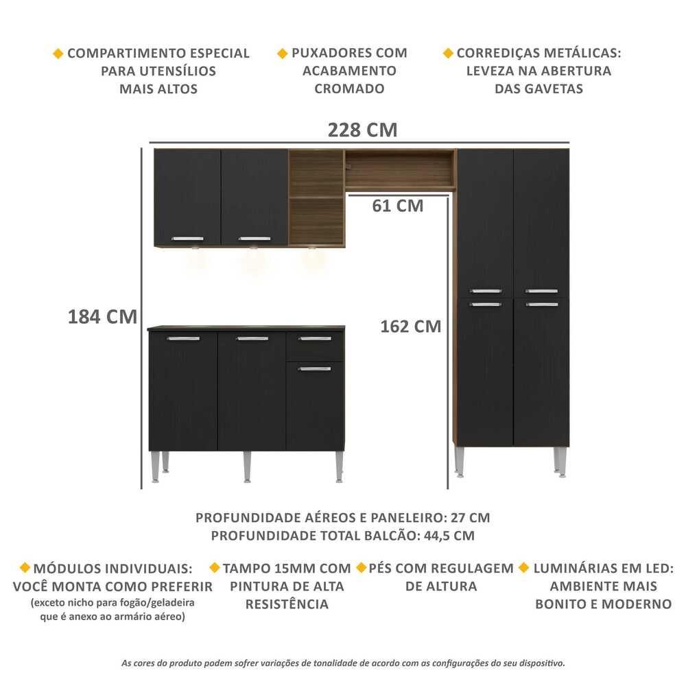 A Cozinha Completa Compacta com 3 Leds, Armário e Balcão com Tampo 3 peças Pequim Up Multimóveis tem um excelente custo benefício e um amplo espaço interno. Os módulos são individuais e você pode montar da maneira que se adaptar melhor ao seu ambiente (exceto o nicho para fogão/geladeira que é anexo ao armário aéreo). Produzida em MDP com acabamento acetinado (cerca de 20% de brilho), que garante maior durabilidade e resistência, possui corrediças metálicas (mais leveza no manuseio), pés com regulagem de altura (permitem um perfeito nivelamento dos módulos), puxadores em ABS com acabamento cromado e tampos em MDP 15mm com pintura de alta resistência. Para deixar sua cozinha mais bonita e organizada, possui compartimento especial para utensílios mais altos e módulo aéreo com nichos. As luminárias em LED, que acompanham a cozinha, proporcionam um visual mais bonito e moderno, deixando o ambiente aconchegante e confortável. Com design minimalista e de fácil instalação, você pode escolher em qual lugar do móvel deseja fixar. Com luz brilhante, a luminária funciona com 3 pilhas AAA. Conteúdo da Embalagem: 1 (um) armário aéreo com nicho lateral e horizontal de 166 cm 1 (um) paneleiro duplo de 62 cm 1 (um) balcão com tampo de 105 cm 1 (um) kit com 3 Luminárias LED Dimensões do produto montado: Cozinha: Altura: 184 cm | Largura: 228 cm | Profundidade: 27 cm (aéreos e paneleiro) - 44,5 cm (balcão com tampo) Espaço do nicho para fogão/geladeira: Altura: 162 cm | Largura: 61 cm *Você pode consultar as medidas internas na imagem técnica do produto. Disponível em 2 opções de cores: Madeirado/Preto Texturizado - Preto Texturizado/Lacca Fumê Brilho *As cores do produto podem sofrer variações de tonalidade de acordo com as configurações do seu dispositivo. Imagem meramente ilustrativa. Decoração e eletros não acompanham o produto. O produto será entregue desmontado e não disponibilizamos o serviço de montagem..