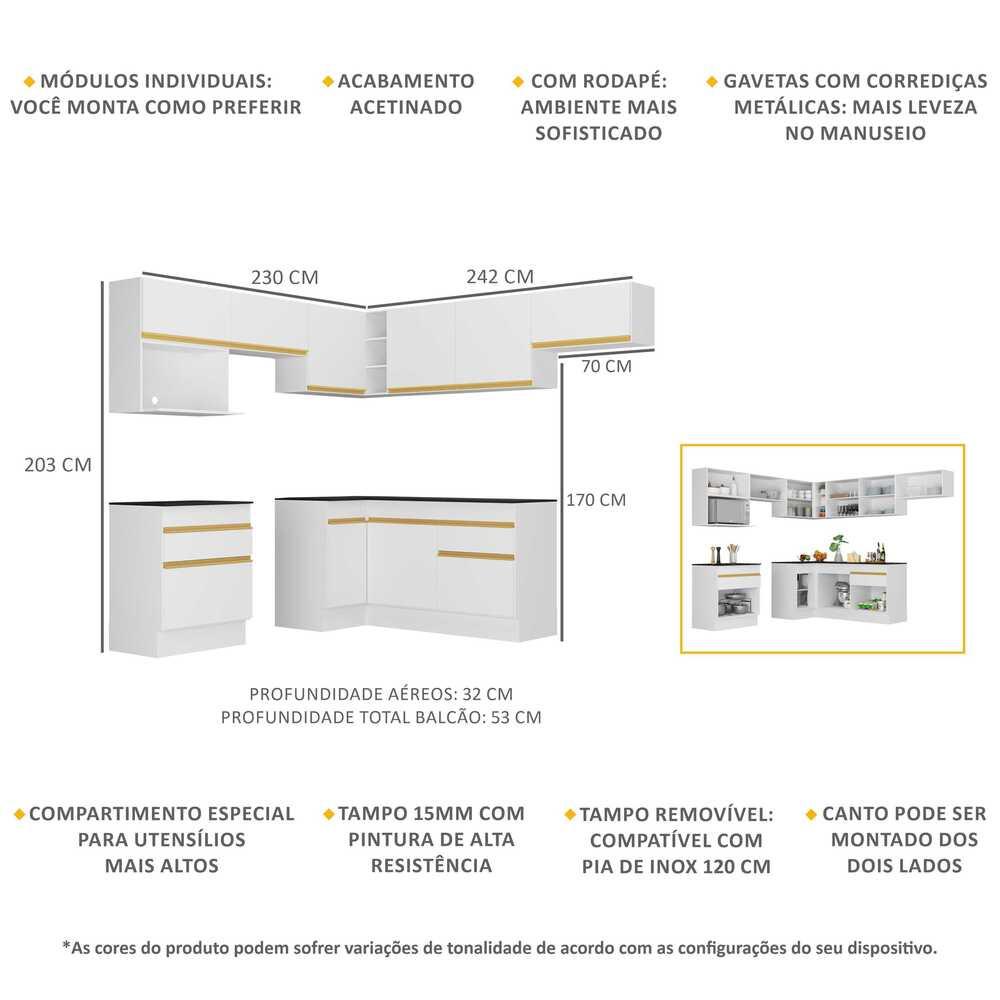 A Cozinha Completa de Canto com Rodapé Veneza Multimóveis MP2106 com Armário e Balcão tem um excelente custo benefício e um amplo espaço interno. Produzida em MDP com acabamento acetinado (cerca de 20% de brilho), que garante maior durabilidade e resistência, possui corrediças metálicas (mais leveza no manuseio), rodapés, que deixam o ambiente mais estiloso, puxadores em ABS e tampo em MDP 15mm com pintura de alta resistência. Os módulos de canto podem ser montados dos dois lados (esquerdo ou direito), conforme a sua preferência. Esta cozinha conta, ainda, com balcão com tampo removível (compatível com pia de 120 cm) com 1 gaveta e 2 portas e balcão para cooktop (o recorte do tampo deve ser realizado na hora da montagem conforme a medida do seu fogão) com 1 gaveta e 1 porta. Os módulos são individuais e você pode montar da maneira que se adaptar melhor ao seu ambiente. Para deixar sua cozinha mais bonita e organizada, possui espaço para microondas, além de compartimento especial para utensílios mais altos. Conteúdo da Embalagem: 3 (três) armários aéreos 70cm 1 (um) armário aéreo de canto 90cm 1 (um) armário aéreo 120cm 1 (um) módulo para microondas 1 (um) balcão com tampo 70cm 1 (um) balcão com tampo de canto 90cm 1 (um) balcão com tampo 120cm 1 (um) kit com rodapés Dimensões do produto montado: Altura: 203cm | Largura: 230 x 242cm | Profundidade: 32cm (aéreos) - 53cm (balcão com tampo) *Você pode consultar as medidas internas na imagem técnica do produto. *As cores do produto podem sofrer variações de tonalidade de acordo com as configurações do seu dispositivo. Imagem meramente ilustrativa. Decoração e eletros não acompanham o produto. O produto será entregue desmontado e não disponibilizamos o serviço de montagem.