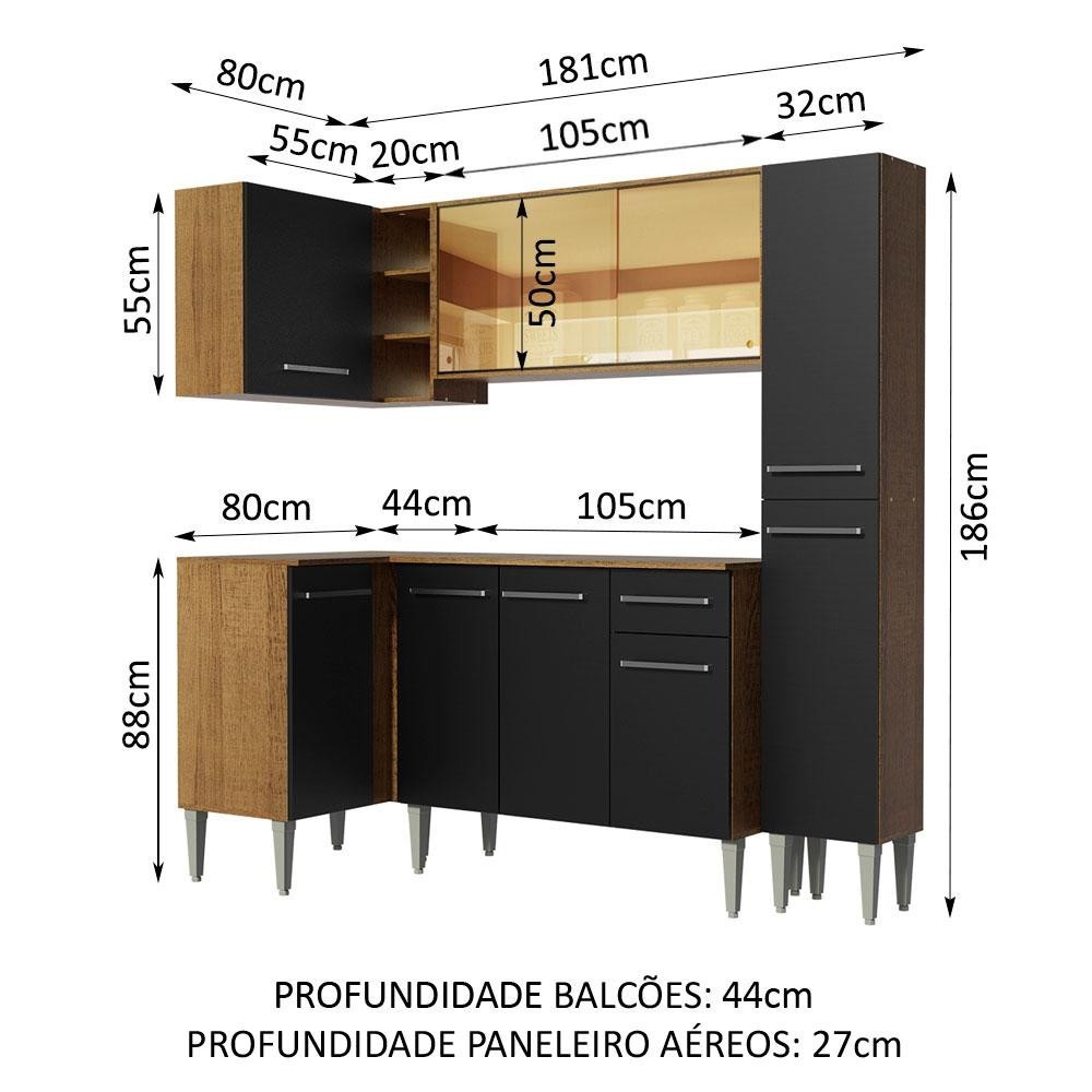 A Cozinha Emilly River de Canto Reto contempla dois balcões, três armários aéreos, uma adega acoplada e um paneleiro, todos com ótimo aproveitamento dos espaços. Assim, fica mais fácil organizar os utensílios e aparelhos da cozinha. Além disso, todos os módulos são separados, possibilitando a montagem conforme a necessidade do seu ambiente. Um dos grandes destaques desta versão é o armário aéreo de 105 cm com duas portas de correr de vidro reflex, que pode refletir o espaço ou mostrar o interior do móvel, variando conforme a luz do ambiente. Um detalhe de muita sofisticação e elegância. A cozinha é fabricada com materiais de qualidade, como puxadores com detalhe em alumínio e corrediças e dobradiças metálicas. Os pés são em PVC, pensados em facilitar a limpeza e reguláveis para nivelar pequenas imperfeições no piso. Para completar, ambos os balcões acompanham tampo em MDP. O acabamento da estrutura é no padrão amadeirado Rustic e as portas e frente são pretas. As partes internas das costas e da gaveta são brancas. O processo é feito em Pintura Poliéster ecológica que oferece resistência contra os efeitos da água e do calor. Os armários aéreos e o paneleiro precisam ser fixados na parede. Medidas totais: 186 cm de altura x 261 cm de largura x 44 cm profundidade nos balcões e 27 cm nos aéreos. Imagens meramente ilustrativas: a decoração não acompanha o produto. Itens inclusos: - Um (1) Armário aéreo de canto com uma (1) porta e uma (1) adega acoplada - Um (1) Balcão de canto com uma (1) portas e tampo - Um (1) Armário aéreo com duas (2) portas de correr de vidro reflex - Um (1) Balcão com três (3) portas, uma (1) gaveta e tampo - Um (1) Paneleiro com duas (2) portas Código do produto: GCEM2610037K Obs.: A Madesa não disponibiliza serviço de montagem. O produto segue com manual e todas as ferragens necessárias para a instalação. 1 – O produto é novo ou usado? R.: Todos os produtos da Madesa são novos, enviados da nossa fábrica diretamente para as casas de nossos clientes. 2 – O produto vem montado? Se não, vocês realizam a montagem? R.: A Madesa não disponibiliza serviço de montagem. Todos os produtos seguem com manual de instalação e as ferragens necessárias. Alguns produtos possuem vídeo explicando o passo a passo da montagem. 3 – Vocês possuem loja física? Posso retirar meu produto em mãos? R.: Não possuímos loja física, apenas loja virtual. Confira as opções de envio ao colocar o seu CEP. 4 – Qual é o valor do envio? Posso pagar separadamente? R.: O valor do envio é calculado com base no peso e volume do produto, e no CEP de destino. Você pode calcular o valor e prazo de entrega no simulador. 5 – A Madesa entrega em todo Brasil? Como é feita a entrega? R.: Sim, entregamos no Brasil inteiro através de transportadoras parceiras. 6 – O produto acompanha Nota Fiscal? R.: Sim, todos os produtos são entregues com suas respectivas notas fiscais. 7 – Os produtos possuem garantia? R.: Sim. A Madesa oferece 3 meses de garantia para defeitos de fabricação. A Madesa possui compromisso com a sustentabilidade. Geramos energia limpa em nossa própria usina, priorizamos fornecedores responsáveis e utilizamos plástico reciclado em nossa produção. Além disso, reinserimos sobras no ciclo de reciclagem e investimos no desenvolvimento de nossos colaboradores e da comunidade. Garantia: Este produto conta com 1 ano de garantia total, sendo 3 meses de garantia legal e 9 meses de garantia contratual. A garantia cobre exclusivamente defeitos de fabricação e vícios ocultos. Não estão cobertos: problemas decorrentes de montagem incorreta, uso inadequado, exposição à umidade, calor ou luz solar direta, modificações no produto ou desgaste natural.