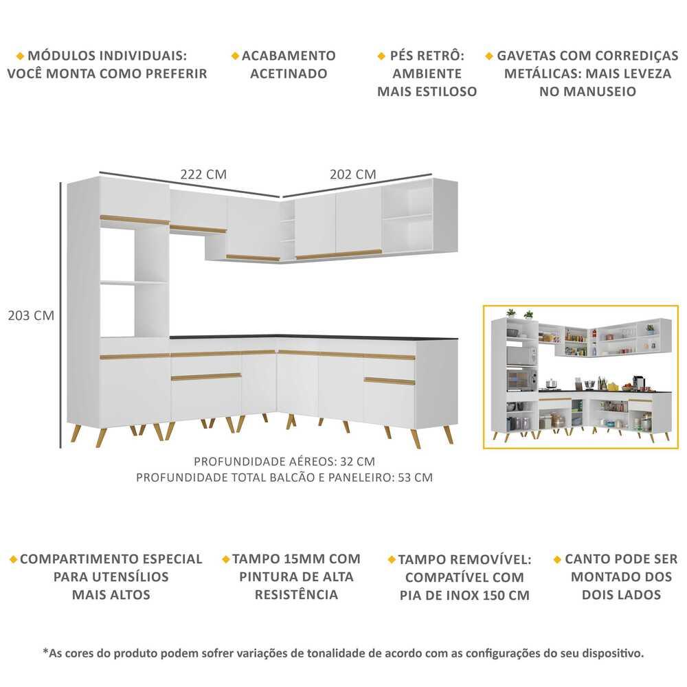 A Cozinha Completa de Canto Veneza Multimóveis MP2045 com Armário e Balcão tem um excelente custo benefício e um amplo espaço interno. Produzida em MDP com acabamento acetinado (cerca de 20% de brilho), que garante maior durabilidade e resistência, possui corrediças metálicas (mais leveza no manuseio), pés retrô em polipropileno, que deixam o ambiente mais estiloso, puxadores em ABS e tampo em MDP 15mm com pintura de alta resistência. Os módulos de canto podem ser montados dos dois lados (esquerdo ou direito), conforme a sua preferência. Esta cozinha conta, ainda, com balcão com tampo removível (compatível com pia de 150 cm), com 1 gaveta e 3 portas e balcão para cooktop (o recorte do tampo deve ser realizado na hora da montagem conforme a medida do seu fogão) com 1 gaveta e 1 porta. Os módulos são individuais e você pode montar da maneira que se adaptar melhor ao seu ambiente. Conteúdo da Embalagem: 1 (um) armário para forno e microondas 62cm 1 (um) armário aéreo 70cm 1 (um) armário aéreo de canto 90cm 1 (um) armário aéreo 150cm 1 (um) balcão com tampo 70cm 1 (um) balcão com tampo de canto 90cm 1 (um) balcão com tampo 150cm Dimensões do produto montado: Altura: 203cm | Largura: 222 x 202cm | Profundidade: 32cm (aéreos) - 53cm (balcão com tampo e paneleiro) *Você pode consultar as medidas internas na imagem técnica do produto. Disponível nas cores: Branco - Preto Acetinado Texturizado *As cores do produto podem sofrer variações de tonalidade de acordo com as configurações do seu dispositivo. Imagem meramente ilustrativa. Decoração e eletros não acompanham o produto. O produto será entregue desmontado e não disponibilizamos o serviço de montagem..
