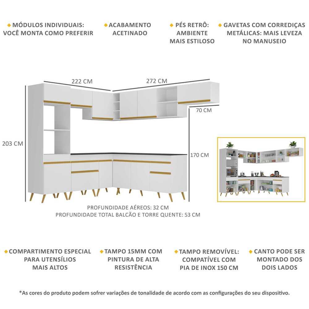 A Cozinha Completa de Canto Veneza Multimóveis MP2048 com Armário e Balcão tem um excelente custo benefício e um amplo espaço interno. Produzida em MDP com acabamento acetinado (cerca de 20% de brilho), que garante maior durabilidade e resistência, possui corrediças metálicas (mais leveza no manuseio), pés retrô em polipropileno, que deixam o ambiente mais estiloso, puxadores em ABS e tampo em MDP 15mm com pintura de alta resistência. Os módulos de canto podem ser montados dos dois lados (esquerdo ou direito), conforme a sua preferência. Esta cozinha conta, ainda, com balcão com tampo removível (compatível com pia de 150 cm), com 1 gaveta e 3 portas e balcão para cooktop (o recorte do tampo deve ser realizado na hora da montagem conforme a medida do seu fogão) com 1 gaveta e 1 porta. Os módulos são individuais e você pode montar da maneira que se adaptar melhor ao seu ambiente. Conteúdo da Embalagem: 1 (um) armário para forno e microondas 62cm 1 (um) armário aéreo 70cm 1 (um) armário aéreo de canto 90cm 1 (um) armário aéreo 150cm 1 (um) balcão com tampo 70cm 1 (um) balcão com tampo de canto 90cm 1 (um) balcão com tampo 150cm 1 (um) armário aéreo 70cm Dimensões do produto montado: Altura: 203cm | Largura: 222 x 272cm | Profundidade: 32cm (aéreos) - 53cm (balcão com tampo e paneleiro) *Você pode consultar as medidas internas na imagem técnica do produto. Disponível nas cores: Branco - Preto Acetinado Texturizado *As cores do produto podem sofrer variações de tonalidade de acordo com as configurações do seu dispositivo. Imagem meramente ilustrativa. Decoração e eletros não acompanham o produto. O produto será entregue desmontado e não disponibilizamos o serviço de montagem..