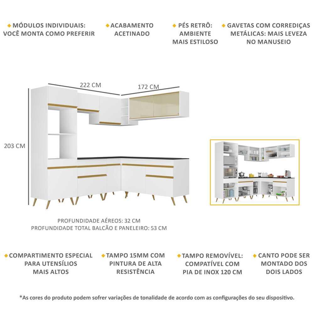 A Cozinha Completa de Canto Veneza Multimóveis MP2064 com Armário e Balcão tem um excelente custo benefício e um amplo espaço interno. Produzida em MDP com acabamento acetinado (cerca de 20% de brilho), que garante maior durabilidade e resistência, possui corrediças metálicas (mais leveza no manuseio), pés retrô em polipropileno, que deixam o ambiente mais estiloso, puxadores em ABS e tampo em MDP 15mm com pintura de alta resistência. Os módulos de canto podem ser montados dos dois lados (esquerdo ou direito), conforme a sua preferência. Esta cozinha conta, ainda, com balcão com tampo removível (compatível com pia de 120 cm), com 1 gaveta e 2 portas e balcão para cooktop (o recorte do tampo deve ser realizado na hora da montagem conforme a medida do seu fogão) com 1 gaveta e 1 porta. Os módulos são individuais e você pode montar da maneira que se adaptar melhor ao seu ambiente. Para deixar sua cozinha mais bonita e organizada, possui vidro reflecta, espaço para forno e microondas e compartimento especial para utensílios mais altos. Conteúdo da Embalagem: 1 (um) armário para forno e microondas 62cm 1 (um) armário aéreo 70cm 1 (um) armário aéreo de canto 90cm 1 (um) armário aéreo com portas de vidro 120cm 1 (um) balcão com tampo 70cm 1 (um) balcão com tampo de canto 90cm 1 (um) balcão com tampo 120cm Dimensões do produto montado: Altura: 203cm | Largura: 222 x 172cm | Profundidade: 32cm (aéreos) - 53cm (balcão com tampo e paneleiro) *Você pode consultar as medidas internas na imagem técnica do produto. Disponível nas cores: Branco - Preto Acetinado Texturizado *As cores do produto podem sofrer variações de tonalidade de acordo com as configurações do seu dispositivo. Imagem meramente ilustrativa. Decoração e eletros não acompanham o produto. O produto será entregue desmontado e não disponibilizamos o serviço de montagem..