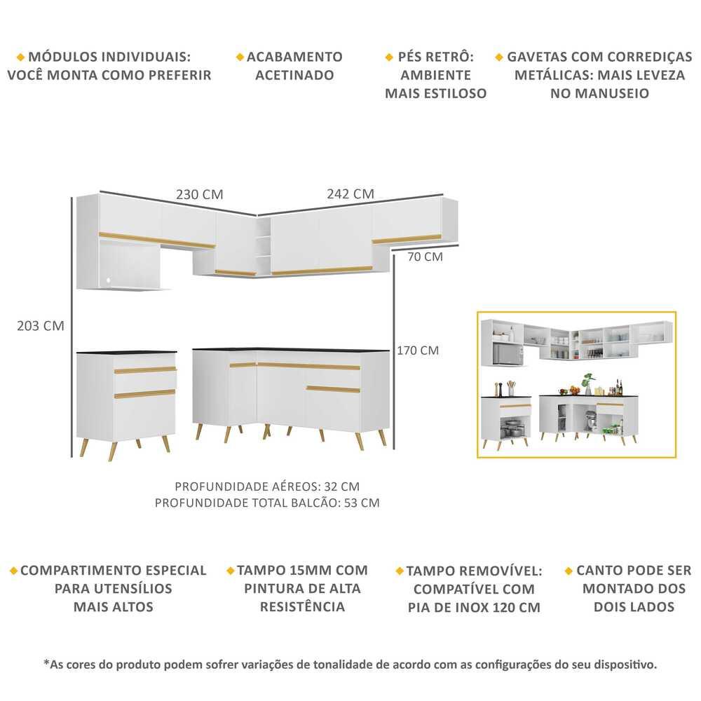 A Cozinha Completa de Canto Veneza Multimóveis MP2071 com Armário e Balcão tem um excelente custo benefício e um amplo espaço interno. Produzida em MDP com acabamento acetinado (cerca de 20% de brilho), que garante maior durabilidade e resistência, possui corrediças metálicas (mais leveza no manuseio), pés retrô em polipropileno, que deixam o ambiente mais estiloso, puxadores em ABS e tampo em MDP 15mm com pintura de alta resistência. Os módulos de canto podem ser montados dos dois lados (esquerdo ou direito), conforme a sua preferência. Esta cozinha conta, ainda, com balcão com tampo removível (compatível com pia de 120 cm) com 1 gaveta e 2 portas e balcão para cooktop (o recorte do tampo deve ser realizado na hora da montagem conforme a medida do seu fogão) com 1 gaveta e 1 porta. Os módulos são individuais e você pode montar da maneira que se adaptar melhor ao seu ambiente. Para deixar sua cozinha mais bonita e organizada, possui espaço para micro-ondas, além de compartimento especial para utensílios mais altos. Conteúdo da Embalagem: 3 (três) armários aéreos 70cm 1 (um) armário aéreo de canto 90cm 1 (um) armário aéreo 120cm 1 (um) módulo para micro-ondas 1 (um) balcão com tampo 70cm 1 (um) balcão com tampo de canto 90cm 1 (um) balcão com tampo 120cm Dimensões do produto montado: Altura: 203cm | Largura: 230 x 242cm | Profundidade: 32cm (aéreos) - 53cm (balcão com tampo) *Você pode consultar as medidas internas na imagem técnica do produto. *As cores do produto podem sofrer variações de tonalidade de acordo com as configurações do seu dispositivo. Imagem meramente ilustrativa. Decoração e eletros não acompanham o produto. O produto será entregue desmontado e não disponibilizamos o serviço de montagem..