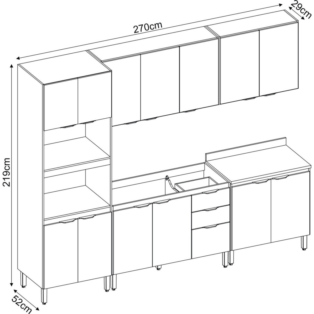 A cozinha modular FIRENZE é formada por uma torre quente com espaço para dois fornos de até 44L, um balcão 120cm com 3 portas e 2 gavetas para pia, um balcão de 80cm que possível usar cocktop,um aéreo 3 portas 120cm com prateleiras internas e um aéreo de 80cm com 2 portas. Seus pés são de polipropileno reguláveis se adequando as condições do chão, puxadores pretos com design moderno, corrediças e dobradiças metálicas. Estruturado em MDP com revestimento ultravioleta e acabamento fosco. Para garantir a qualidade do produto dentro da embalagem, as caixas são revestidas por um plástico termoencolhível e todas as peças são separadas por isomanta,tudo para preservar e evitar o atrito entre as peças dentro da embalagem. Modular: Sim Peso (kg): 149.64 Garantia: 03 Meses Altura (cm): 219 Acabamento: Pintura Largura (cm): 270 Possui Pés: Sim Possui Portas: Sim Tipo de Porta: Bater Pés Reguláveis: Sim Possui Gavetas: Sim Possui Rodízio: Não Acompanha Tampo: Não Profundidade (cm): 52 Escala de Brilho: Fosco Gaveta com Chave: Não Material dos Pés: PVC Material da Porta: MDP Origem do Produto: Nacional Ambiente Principal: Cozinha Balcão Suporta Pia: Sim Material da Gaveta: MDP Material Principal: MDP Possui Prateleiras: Sim Acabamento da Porta: Pintura Quantidade de Peças: 5 Sapatas Niveladoras: Não Acabamento da Gaveta: Pintura Balcão Acompanha Pia: Não Material da Corrediça: Metálica Material da Prateleira: MDP Peso Máximo por Gaveta: 3 Acabamento da Prateleira: Pintura Tipo de Puxador da Porta: Externo Escala de Brilho da Porta: Fosco Tipo de Puxador da Gaveta: Externo Peso Máximo por Prateleira: 3 Tipo de Armário de Cozinha: Cozinha Completa Possui Recorte para Cooktop: Não Tipo de Corrediça da Gaveta: Metálica Telescópica Material do Puxador da Porta: Plástico Material do Puxador da Gaveta: Plástico Escala de Brilho da Prateleira: Fosco Medida de Cada Item (A x L x P) (novo): Paneleiro Duplo Forno 219 x 70 x 52 / Armário Aéreo 3 Portas 120cm 67 x 120 x 29 / Balcão 84 x 120 x 52 / Armário Aéreo 2 Portas 80cm /Balcão 2P 80CM Tipo de Dobradiça/Corrediça da Porta: Simples Material da Dobradiça/Corrediça da Porta: Metálica Marca: Demóbile Cor Interna: Amendola Cor: Amendola/Nude Prime Tx Cor do Produto: Amendola/Nude Prime Tx Itens Inclusos: 1 Cozinha, kit de ferragens e manual de montagem Cor Predominante: Cinza Linha ou Coleção: Firenze Quantidade de Prateleiras: 05 Prateleiras Tamanho Indicado da Pia (L x C): 119,5X52CM Tamanho Indicado do Tampo (L x P): 120