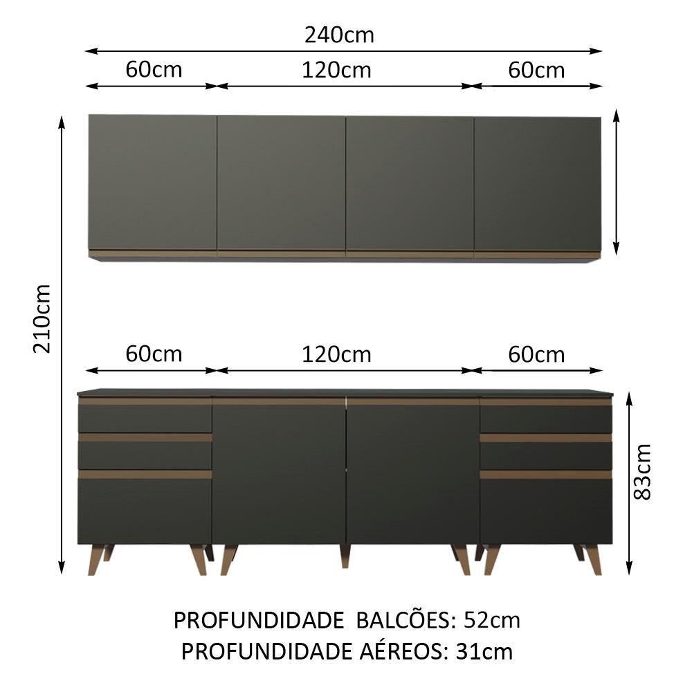 Moderna e aconchegante, a linha de Cozinhas Reims da Madesa foi desenvolvida levando em conta as últimas tendências mundiais de design. É fabricada com materiais de alto padrão, como corrediças e dobradiças metálicas. Os puxadores são embutidos, em alumínio na coloração marrom. Os pés em madeira são um charme a parte que além de beleza, conferem firmeza e resistência ao móvel. Para completar, os módulos são avulsos, o que permite a montagem conforme a necessidade do ambiente. Além disso, todos os balcões acompanham tampo, e o do balcão maior pode ser removido para colocação de pia com espaço de 120 x 52 cm. O acabamento da cozinha é preto e os pés são em amadeirado Rustic. A parte interna das gavetas e as costas da cozinha são brancas. O processo é feito em Pintura Poliéster ecológica de alta resistência, que dá maior destaque à tonalidade e conserva a beleza do móvel por mais tempo. As medidas totais são: 240 cm de largura e 210 cm de altura. A profundidade é de cozinha planejada: 52 cm nos balcões e 31 cm nos aéreos. (Imagens meramente ilustrativas: os eletros e as decorações não acompanham o produto.) Itens inclusos: - Dois (2) Aéreos de 60 cm com duas (2) portas - Dois (2) Balcões de 60 cm com três (3) gavetas e tampo - Um (1) Aéreo de 120 cm com duas (2) portas - Um (1) Balcão de 120 cm com duas (2) portas Código do produto: GRRM240002D8 Obs.: A Madesa não disponibiliza serviço de montagem. O produto segue com manual e todas as ferragens necessárias para a instalação. A Madesa possui compromisso com a sustentabilidade. Geramos energia limpa em nossa própria usina, priorizamos fornecedores responsáveis e utilizamos plástico reciclado em nossa produção. Além disso, reinserimos sobras no ciclo de reciclagem e investimos no desenvolvimento de nossos colaboradores e da comunidade. Garantia: Este produto conta com 1 ano de garantia total, sendo 3 meses de garantia legal e 9 meses de garantia contratual. A garantia cobre exclusivamente defeitos de fabricação e vícios ocultos. Não estão cobertos: problemas decorrentes de montagem incorreta, uso inadequado, exposição à umidade, calor ou luz solar direta, modificações no produto ou desgaste natural.