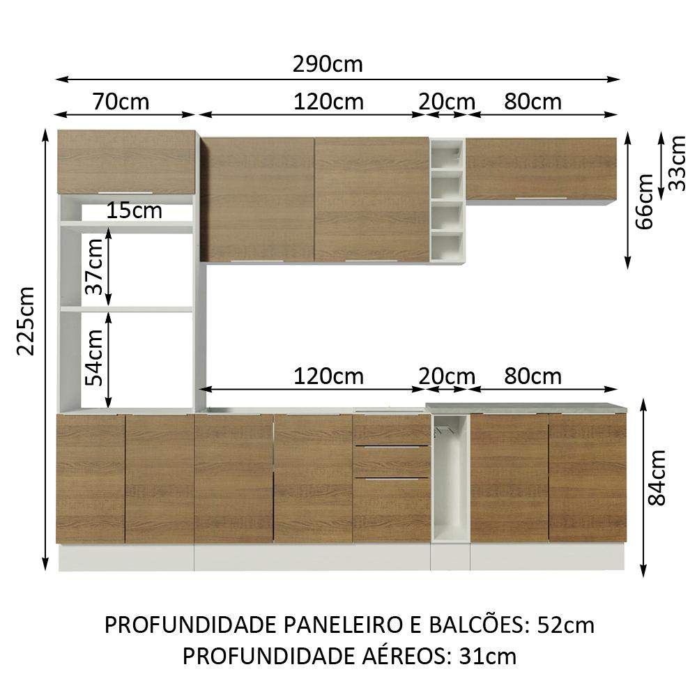 Uma linha totalmente modulada, fabricada com itens de alto padrão e design atual. Conheça as cozinhas Stella da Madesa. Entre as principais características da linha estão os puxadores em alumínio no modelo slim, as gavetas com corrediças telescópicas de abertura total e as portas com amortecimento para fechamento suave. Todos estes diferenciais agregam valor, pois prolongam a vida útil do móvel. O espaço para organização dos utensílios da cozinha é ótimo. A torre quente possui nichos para dois fornos e fundo aberto com saída para o calor. Também permite a instalação de forno embutido. O balcão maior tem espaço para pia de 120 x 52 cm e não acompanha tampo. O balcão de 80 cm possui tampo que pode ser recortado para instalação de cooktop. Para completar, a cozinha contempla adega e balcão porta-pano. Outro diferencial são os pés reguláveis em PVC com rodapé removível de MDP de encaixe fácil. Este detalhe facilita muito a limpeza. As medidas totais são: 290 cm de largura e 225 cm de altura. Profundidade de 52 cm nos balcões na torre e 31 cm nos aéreos. O acabamento da estrutura é branco e as portas e frentes são no padrão amadeirado Rustic. O processo é feito com a Pintura Poliéster exclusiva e patenteada da Madesa. Um método que não agride o meio ambiente e protege o móvel dos efeitos da água e do calor. Esta cozinha pode ser complementada pelos módulos avulsos da linha Stella da Madesa. (As imagens são meramente ilustrativas: a decoração não acompanha o produto.) Itens inclusos: - Uma (1) Torre quente com dois (2) nichos para forno e micro-ondas, um (1) nicho menor e três (3) portas, sendo uma (1) basculante - Um (1) Balcão de pia com duas (2) portas, três (3) gavetas e um (1) porta-talheres - Um (1) Balcão porta-panos com duas (2) hastes metálicas e tampo de MDP em pintura Mood - Um (1) Balcão com duas (2) portas e tampo de MDP em pintura Mood - Um (1) Aéreo com duas (2) portas - Uma (1) Adega com quatro (4) nichos abertos - Um (1) Aéreo com uma (1) porta basculante Código do produto: GRTE2900019B Obs.: A Madesa não disponibiliza serviço de montagem. O produto segue com manual e todas as ferragens necessárias para a instalação. 1 – O produto é novo ou usado? R.: Todos os produtos da Madesa são novos, enviados da nossa fábrica diretamente para as casas de nossos clientes. 2 – O produto vem montado? Se não, vocês realizam a montagem? R.: A Madesa não disponibiliza serviço de montagem. Todos os produtos seguem com manual de instalação e as ferragens necessárias. Alguns produtos possuem vídeo explicando o passo a passo da montagem. 3 – Vocês possuem loja física? Posso retirar meu produto em mãos? R.: Não possuímos loja física, apenas loja virtual. Confira as opções de envio ao colocar o seu CEP. 4 – Qual é o valor do envio? Posso pagar separadamente? R.: O valor do envio é calculado com base no peso e volume do produto, e no CEP de destino. Você pode calcular o valor e prazo de entrega no simulador. 5 – A Madesa entrega em todo Brasil? Como é feita a entrega? R.: Sim, entregamos no Brasil inteiro através de transportadoras parceiras. A Madesa possui compromisso com a sustentabilidade. Geramos energia limpa em nossa própria usina, priorizamos fornecedores responsáveis e utilizamos plástico reciclado em nossa produção. Além disso, reinserimos sobras no ciclo de reciclagem e investimos no desenvolvimento de nossos colaboradores e da comunidade. Garantia: Este produto conta com 1 ano de garantia total, sendo 3 meses de garantia legal e 9 meses de garantia contratual. A garantia cobre exclusivamente defeitos de fabricação e vícios ocultos. Não estão cobertos: problemas decorrentes de montagem incorreta, uso inadequado, exposição à umidade, calor ou luz solar direta, modificações no produto ou desgaste natural.