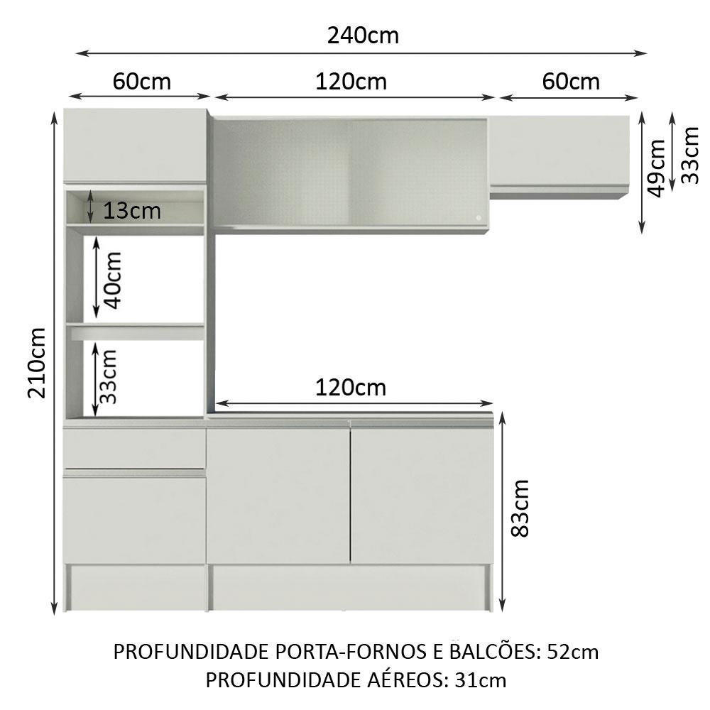 A Cozinha Completa Topazio da Madesa é totalmente versátil e combina com ambientes modernos, retrô ou coloridos. Conta com materiais de qualidade, como puxadores em perfil total de alumínio, dobradiças e corrediças metálicas. Além disso, o aéreo com portas de vidro agrega beleza e sofisticação. Contempla o tampo do balcão de pia que pode ser removido para a colocação de uma pia com as medidas de até 120 cm x 52 cm. O acabamento da estrutura interna e externa é branco. O processo é feito em Poliéster Protetor ecológico, que consiste na aplicação de 7 camadas resistentes a álcool, água e calor. As medidas totais são: 240 cm de largura e 210 cm de altura; profundidades de 31 cm nos aéreos e 52 cm nos balcões e na torre. (As imagens são meramente ilustrativas. Os eletros e as decorações não acompanham o produto.) Itens inclusos: - Uma (1) torre com nichos para forno e micro-ondas, com uma (1) gaveta e duas (2) portas, sendo uma basculante - Um (1) balcão de 120 cm com duas (2) portas - Um (1) aéreo de 120 cm com portas deslizantes em vidro - Um (1) tampo de MDP branco para balcão de pia de 120 cm x 52 cm - Um (1) aéreo de 60 cm com porta basculante Código do produto: GRTP24000109 Obs: A Madesa não disponibiliza serviço de montagem. O produto segue com manual e todas as ferragens necessárias para a instalação. A Madesa possui compromisso com a sustentabilidade. Geramos energia limpa em nossa própria usina, priorizamos fornecedores responsáveis e utilizamos plástico reciclado em nossa produção. Além disso, reinserimos sobras no ciclo de reciclagem e investimos no desenvolvimento de nossos colaboradores e da comunidade. Garantia: Este produto conta com 1 ano de garantia total, sendo 3 meses de garantia legal e 9 meses de garantia contratual. A garantia cobre exclusivamente defeitos de fabricação e vícios ocultos. Não estão cobertos: problemas decorrentes de montagem incorreta, uso inadequado, exposição à umidade, calor ou luz solar direta, modificações no produto ou desgaste natural.