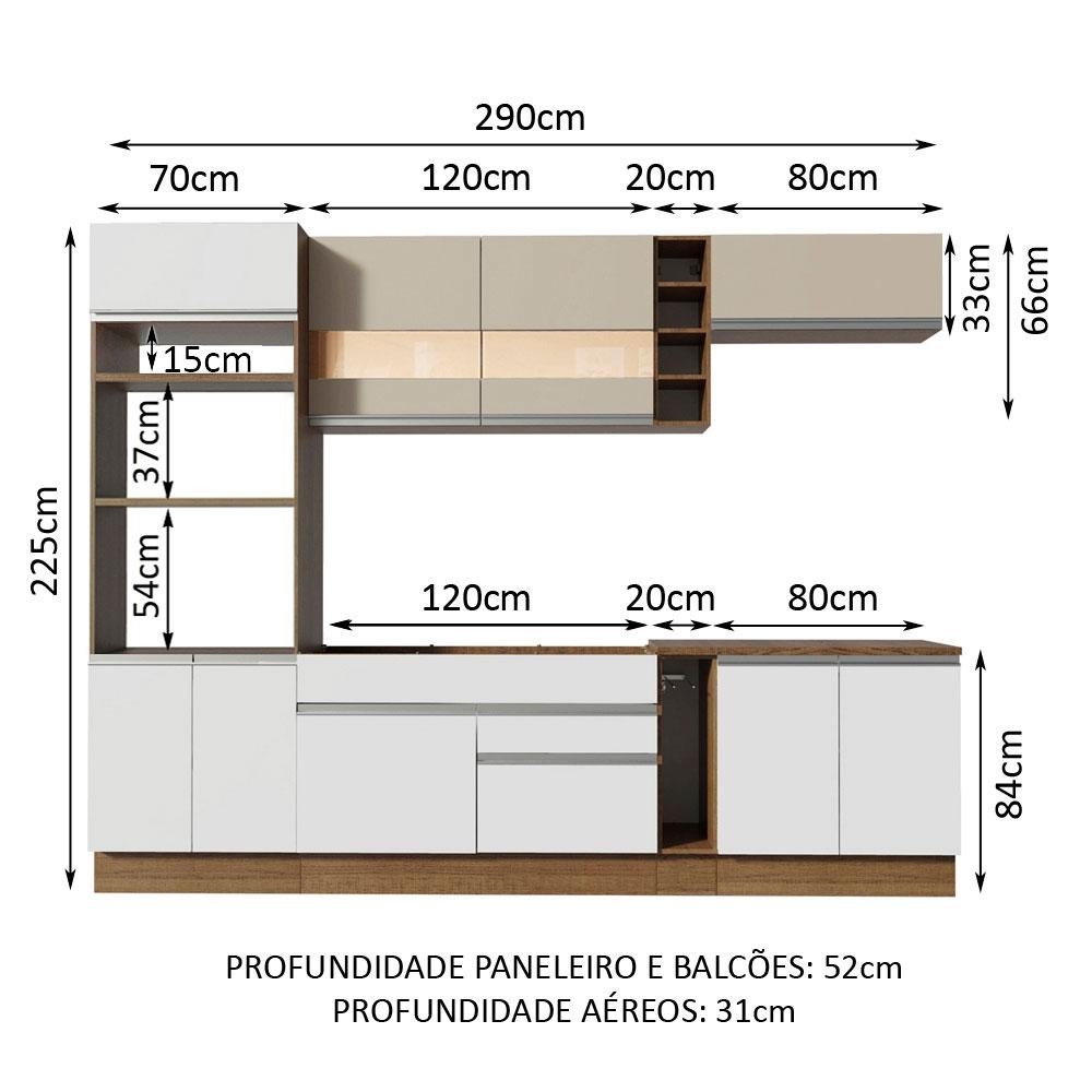 A Cozinha Vicenza Glamy é a campeã de vendas da Madesa. Uma cozinha completa com design moderno e um ótimo acabamento. Se destaca por parecer uma cozinha planejada com ótimo aproveitamento dos espaços internos. As gavetas possuem corrediças telescópicas e todas as portas possuem amortecedor para o fechamento suave. Esses itens de qualidade superior conferem durabilidade e maior vida útil do móvel. Outro grande diferencial desta cozinha é a profundidade maior, como uma cozinha planejada: 52 cm no balcão inferior e 31 cm nos aéreos. As medidas totais são: 290 cm de largura e 225 cm de altura. O balcão de pia comporta pias de 120 cm x 52 cm. Já o balcão para cooktop segue com tampo de 80 cm x 52 cm que pode ser recortado para a colocação do cooktop. Possui também pés reguláveis e rodapé removível. Para completar, com opção de aéreos na cor crema com detalhe em vidro reflex conferindo elegância ao ambiente. Esta cozinha pode ser complementada pelos módulos avulsos da linha Glamy da Madesa. (Imagens meramente ilustrativas: os eletros, o tampo da pia, a torneira e a decoração não acompanham o produto.) Itens inclusos: - Um (1) porta fornos com dois (2) nichos para forno e micro-ondas e três (3) portas sendo uma (1) basculante - Um (1) balcão de pia com duas (2) gavetas e uma (1) porta (não acompanha tampo) - Um (1) porta panos - Um (1) balcão com duas (2) portas e tampo - Um (1) aéreo com duas (2) portas com detalhe em vidro reflex - Um (1) aéreo com uma (1) porta basculante - Uma (1) adega Código do produto: G20150074LST Obs.: A Madesa não disponibiliza serviço de montagem. O produto segue com manual e todas as ferragens necessárias para a instalação. A Madesa possui compromisso com a sustentabilidade. Geramos energia limpa em nossa própria usina, priorizamos fornecedores responsáveis e utilizamos plástico reciclado em nossa produção. Além disso, reinserimos sobras no ciclo de reciclagem e investimos no desenvolvimento de nossos colaboradores e da comunidade. Garantia: Este produto conta com 1 ano de garantia total, sendo 3 meses de garantia legal e 9 meses de garantia contratual. A garantia cobre exclusivamente defeitos de fabricação e vícios ocultos. Não estão cobertos: problemas decorrentes de montagem incorreta, uso inadequado, exposição à umidade, calor ou luz solar direta, modificações no produto ou desgaste natural.