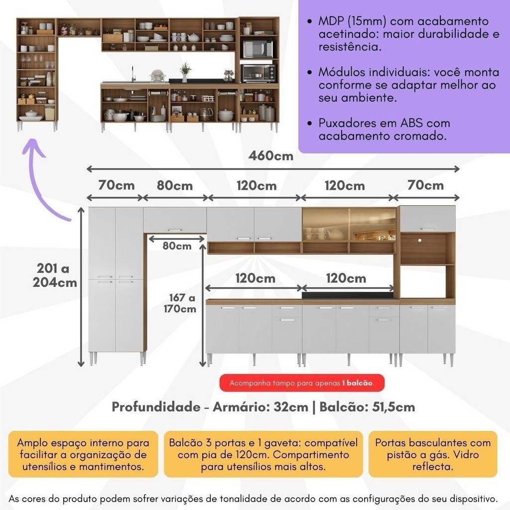 A Cozinha Completa Modulada 7 Peças Paris é uma solução completa e versátil para sua cozinha. Produzida em MDP de 15mm, este conjunto oferece durabilidade e resistência, enquanto seu acabamento acetinado adiciona um toque de elegância, com cerca de 20% de brilho, elevando o ambiente da sua casa. Os dois armários aéreos de 120cm são projetados para otimizar o espaço, com nichos na parte inferior ideais para organizar utensílios menores, como temperos. Um dos armários apresenta portas de correr em vidro reflecta, proporcionando um visual moderno e sofisticado. O armário aéreo de 80cm destaca-se pela sua porta basculante equipada com pistão a gás, garantindo abertura suave e fácil acesso ao seu conteúdo. Além disso, o paneleiro com 4 portas e a torre quente, com compartimento específico para forno e microondas, oferecem ampla capacidade de armazenamento para todos os seus utensílios de cozinha. Com dois balcões compatíveis com pia de 120cm, este conjunto proporciona praticidade e funcionalidade. Apenas um dos balcões vem com tampo, oferecendo uma superfície útil para suas atividades culinárias. Cada balcão possui uma gaveta com corrediças telescópicas, garantindo um deslizamento suave e silencioso. Os puxadores em ABS com acabamento cromado proporcionam uma aderência confortável e durável, enquanto os pés em polipropileno com regulagem de altura garantem estabilidade em qualquer tipo de piso, adaptando-se às suas necessidades específicas. Com um amplo espaço interno em todos os módulos, esta cozinha modulada oferece organização impecável para todos os seus utensílios, ingredientes e acessórios. Os módulos são individuais e permitem montagem conforme a necessidade do ambiente. Conteúdo da Embalagem: 1 (um) Paneleiro 70cm 1 (uma) Torre Quente 70cm 1 (um) Balcão 120cm sem tampo 1 (um) Balcão 120cm com tampo 1 (um) Armário Aéreo 120cm com Portas de vidro 1 (um) Armário Aéreo 120cm 1 (um) Armário Aéreo 80cm Manual de Montagem Kit Ferragem Dimensões do produto montado: Altura: 204cm | Largura: 460cm | Profundidade: 51,5cm Espaço do nicho para fogão/geladeira: Altura: 170cm | Largura: 80cm *Você pode consultar as medidas detalhadas na imagem técnica do produto. *As cores do produto podem sofrer variações de tonalidade de acordo com as configurações do seu dispositivo. Imagem meramente ilustrativa. Decoração e eletros não acompanham o produto. O produto será entregue desmontado e não disponibilizamos o serviço de montagem.