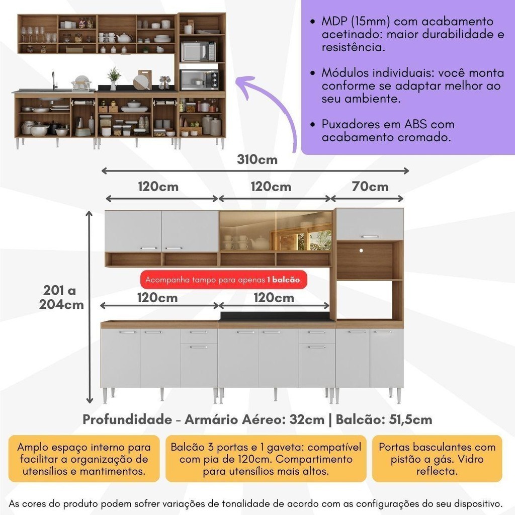 A Cozinha Completa Modulada Paris da Multimóveis possui muita funcionalidade e estilo para sua casa. Fabricada com materiais de alta qualidade, este conjunto é produzido em MDP de 15mm, garantindo durabilidade e resistência para o seu dia a dia. O acabamento acetinado confere uma elegância sutil, com aproximadamente 20% de brilho, elevando o ambiente da sua cozinha. Com a torre quente estrategicamente projetada, você encontrará um espaço específico para o forno e o micro-ondas, mantendo sua cozinha organizada e pronta para o preparo de suas receitas favoritas. Os 2 armários aéreos de 120cm oferecem nichos na parte inferior, perfeitos para armazenar utensílios menores, como temperos, proporcionando praticidade ao seu alcance. Um dos armários possui portas de correr em vidro reflecta, adicionando um toque de modernidade ao design. Contando com 2 balcões compatíveis com pia de 120cm, este conjunto oferece versatilidade incomparável. Um dos balcões vem com tampo, facilitando suas tarefas diárias. Cada balcão é equipado com uma gaveta com corrediças telescópicas, garantindo um deslizamento suave e silencioso, além de facilitar o acesso aos seus utensílios de cozinha. Os puxadores em ABS com acabamento cromado proporcionam uma pegada confortável e durável, enquanto os pés em polipropileno com regulagem de altura garantem estabilidade em qualquer tipo de piso, adaptando-se perfeitamente às suas necessidades. Com um amplo espaço interno em todos os módulos, esta cozinha modulada proporciona organização impecável para todos os seus utensílios, ingredientes e acessórios, tornando-a a escolha ideal para quem busca praticidade sem abrir mão do estilo. Os módulos são individuais e permitem montagem conforme a necessidade do ambiente. Conteúdo da Embalagem: 1 (uma) Torre Quente 70cm 1 (um) Balcão 120cm sem tampo 1 (um) Balcão 120cm com tampo 1 (um) Armário Aéreo 120cm com Portas de Vidro 1 (um) Armário Aéreo 120cm Manual de Montagem Kit Ferragem Dimensões do produto montado: Altura: 204cm | Largura: 310cm | Profundidade: 51,5cm *Você pode consultar as medidas detalhadas na imagem técnica do produto. *As cores do produto podem sofrer variações de tonalidade de acordo com as configurações do seu dispositivo. Imagem meramente ilustrativa. Decoração e eletros não acompanham o produto. O produto será entregue desmontado e não disponibilizamos o serviço de montagem.