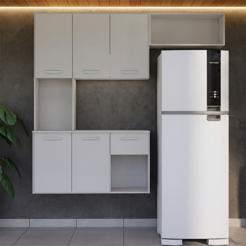 Armário de Cozinha Suspenso – Organização Inteligente e Design Moderno Transforme sua cozinha com este armário suspenso, a solução perfeita para quem busca otimizar espaço sem abrir mão do estilo. Com um design moderno e nichos estrategicamente planejados, ele é ideal para organizar eletrodomésticos, mantimentos e utensílios, deixando tudo ao alcance das mãos. Seu acabamento clean combina com qualquer decoração, proporcionando um ambiente mais leve e funcional. Destaques do Produto: Design Suspenso: Facilita a limpeza do piso e aproveita melhor as paredes. Espaço Inteligente: O nicho lateral é perfeito para otimizar o layout da sua cozinha. Multiuso: Possui portas para organizar seus itens, gaveta para talheres e nichos abertos para decoração ou itens de uso frequente. Durabilidade: Material resistente com orientações claras de conservação para maior vida útil. Especificações Técnicas (Medidas): Altura Total: 140,6 cm Largura Total: 150 cm Profundidade: 35,2 cm (base inferior) / 25 cm (módulos superiores) Largura do Nicho da Base: 91 cm Capacidade de Carga: * Prateleiras Superiores: Até 5kg cada Base Inferior: Até 10kg Gaveta: 17 cm de altura Conteúdo da Embalagem: 1 Armário de Cozinha (desmontado). Kit de ferragens para montagem. Manual de instruções. Dicas de Conservação: Para manter seu móvel sempre novo, utilize apenas uma flanela seca ou levemente umedecida com água. Evite: produtos químicos (solventes, thinner, acetona), esponjas de aço ou escovas abrasivas. Por que comprar conosco? Envio Imediato: Produto em estoque pronto para o despacho. Embalagem Segura: Proteção reforçada para que seu produto chegue impecável. Garantia: 30 dias contra defeitos de fabricação. Atendimento Exclusivo: Suporte pré e pós-venda para tirar todas as suas dúvidas. Aproveite e renove sua cozinha hoje mesmo!