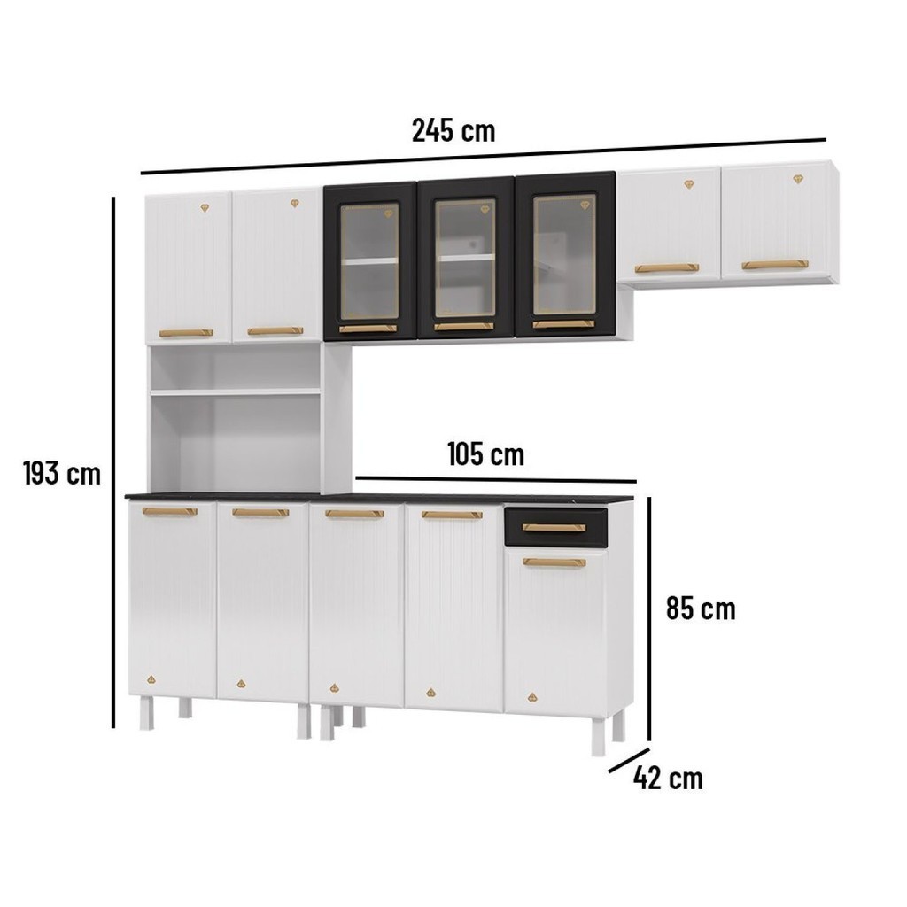A linha Diamante é aposta certa para trazer mais praticidade, resistência e brilho para a sua cozinha. Essa composição conta com 3 módulos robustos - fabricados inteiramente em aço - que passam por pintura eletrostática de acabamento brilhoso, um processo que confere qualidade, proteção anticorrosiva e mais resistência ao móvel. Internamente, é possível acomodar panelas, louças, travessas ou alimentos - de maneira organizada e muito funcional. O módulo Kit é um grande aliado aqui: possui espaço reservado para micro-ondas, forno ou qualquer eletro que você precise ter sempre ao alcance das mãos – de forma prática e ergonômica. O Armário aéreo é um daqueles itens queridinhos para armazenar e também decorar a cozinha, além dos belos vidros serem serigrafados e temperados, para maior segurança. O Balcão é outro coringa tanto para organização quando preparo das refeições; ele possui uma gaveta que pode acomodar talheres e utensílios para que estejam sempre à mão. A estrutura interna desta gaveta é de plástico muito rígido, resistente e fácil de lavar. As delicadas linhas verticais das portas desta cozinha – inspiradas na tendência atual da decoração - em combinação com o aplique em alto relevo do “diamante” e o belo puxador em tom dourado, fazem o ambiente brilhar. Complemente essa cozinha outros itens da mesma linha para criar o ambiente dos seus sonhos. Estilo: Moderno Modular: Sim Peso (kg): 64.48 Garantia: 12 Meses Altura (cm): 193 Acabamento: Pintura Largura (cm): 245 Possui Pés: Sim Possui Portas: Sim Tipo de Porta: Bater Altura dos Pés: 14.6 Pés Reguláveis: Sim Possui Gavetas: Sim Possui Rodízio: Não Suporta Até (kg): 210 Acompanha Tampo: Sim Profundidade (cm): 42 Escala de Brilho: Brilhante Gaveta com Chave: Não Material dos Pés: Polipropileno Material da Porta: Aço Material do Fundo: Aço Material do Tampo: MDP Origem do Produto: Nacional Acabamento dos Pés: Polipropileno Ambiente Principal: Cozinha Balcão Suporta Pia: Não Material da Gaveta: Polipropileno Material Principal: Aço Possui Prateleiras: Sim Acabamento da Porta: Pintura Quantidade de Peças: 4 Sapatas Niveladoras: Não Acabamento da Gaveta: Polipropileno Balcão Acompanha Pia: Não Material da Corrediça: Aço Material da Prateleira: Aço Peso Máximo por Gaveta: 3 Acabamento da Prateleira: Pintura Tipo de Puxador da Porta: Externo Escala de Brilho da Porta: Brilhante Tipo de Puxador da Gaveta: Externo Escala de Brilho da Gaveta: Brilhante Peso Máximo por Prateleira: 15 Tipo de Armário de Cozinha: Cozinha Compacta Possui Recorte para Cooktop: Não Tipo de Corrediça da Gaveta: Metálica Simples Material do Puxador da Porta: Poliestireno Material do Puxador da Gaveta: Poliestireno Escala de Brilho da Prateleira: Brilhante Medida de Cada Item (A x L x P) (novo): Armário Duplo: 37,5cm x 70cm x 29cm; Armário Triplo: 55cm x 105cm x 29cm; Balcão: 84,5cm x 105cm x 43cm x Kit Duplo: 193cm x 70cm x 44,5cm Tipo de Dobradiça/Corrediça da Porta: Simples Material da Dobradiça/Corrediça da Porta: Metálica Marca: Telasul Tonalidade: Preto / Branco Cor: Branco/Preto Cor do Produto: Branco/Preto Itens Inclusos: Cozinha,kit ferragens e manual de montagem Cor Predominante: Branco Linha ou Coleção: DIAMANTE Quantidade de Prateleiras: 04 Prateleiras Quantidade de Portas: 12 Portas Medida do Recorte para Cooktop: Não se aplica