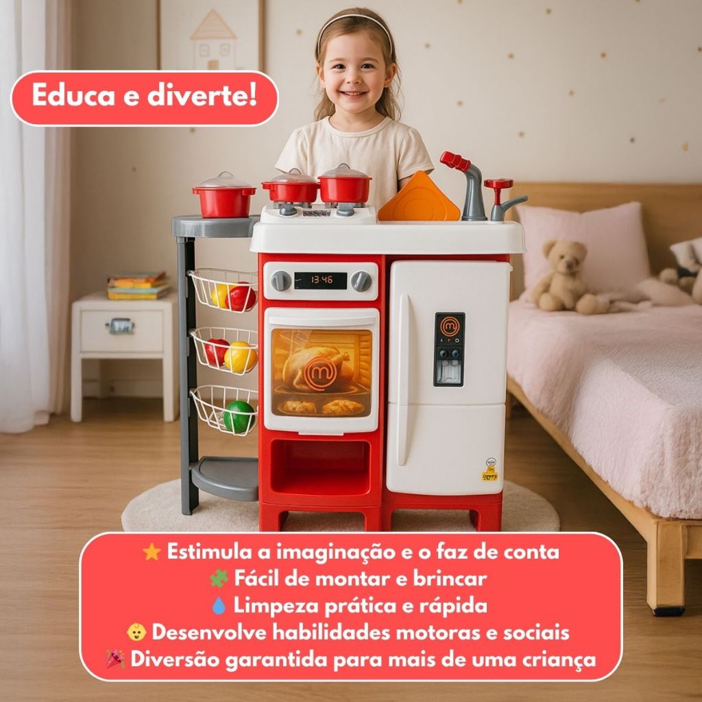 Cozinha Grande Infantil Completa Master Chef com Acessórios Brincadeira de Faz de Conta com Estilo Profissional! Desperte o pequeno chef que existe na sua criança com essa cozinha completa, divertida e cheia de estilo! Inspirada no universo do MasterChef, ela vem com forno, fogão, pia, geladeira e diversos acessórios incríveis para deixar a brincadeira ainda mais realista. A cozinha completa Contem: 1-Fogão 1-Forno 1-Geladeira 1-Micro-ondas 1-Torneira que sai agua de verdade 1-Estante lateral com cestos para alimentos 1-Suporte para celular 6-Frutinhas com velcro 3-Panelas 2-Pratos 3-utensilios 6-talheres 1-avental personalisado master chef ESPECIFICAÇÕES: Idade recomendada: +3 anos Produto Certificado e Aprovado pelo INMETRO;
