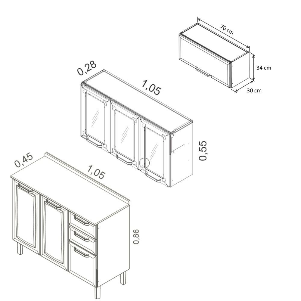 Kit Balcão Branco c/ Armário Aéreo 3 Portas 3 Vidros Branco e 1 Armário Aéreo 1 Porta Horizontal Branco Sua cozinha completa e com a sofisticação que você merece! O conjunto Balcão 2 Gavetas e 3 Portas, com o Armário Aéreo 1 Porta Horizontal e Armário Aéreo 3 Portas Itatiaia é a sua opção de aproveitamento de espaço e estilo para sua Cozinha. O formato sugerido em "asa" fica adequado para receber fogão e geladeira nas laterais, ou mesmo ocupar espaços disponíveis sem sobrecarregar sua cozinha ou espaço externo. Os produtos Itatiaia trazem praticidade e estilo com a qualidade de quem é referência em cozinhas. ATENÇÃO: - Não nos responsabilizamos pela montagem / instalação dos produtos. - Imagens meramente ilustrativas. - Verifique com os fabricantes dos produtos eventuais limitações à utilização de todos os recursos e funcionalidades. Modelo: Balcão Cozinha Itatiaia Luce 2 Portas 3 Gavetas Branco IG3G2-105 + Armário Aéreo 3 Portas 3 Vidros Luce Branco + 1 Armário Aéreo 1 Porta Horizontal Branco Linha: Luce Material: Aço Pintura / Revestimento: corpo e porta revestidos com pintura eletrostática a pó Acabamento da pintura: brilho Corrediças: Telescópicas Quantidade de gavetas: 2 Quantidade de portas: 7 Quantidade de prateleiras: 6 Possuí Vidros: 3 Necessita Montagem: sim Sistema de montagem: Parafusos - Balcão Cozinha Itatiaia Luce 2 Portas 3 Gavetas IG3G2-105 Dimensões do produto montado (cm): 45,0 (P) x 105,0 (L) x 86,0 (A) Peso do produto com embalagem (kg): 21,92 - Armário de Cozinha Aereo Itatiaia Luce 3 Portas IPV3-105 Dimensões do produto montado (cm): 28,0 (P) x 105,0 (L) x 55,0 (A) Peso do produto com embalagem (kg): 11,67 - Armário de Cozinha Aereo Itatiaia Luce 1 Porta Horizontal IPH-70 Dimensões de cada produto montado (cm): 26,0 (A) x 70,0 (L) x 28,0 (P) Peso do produto com embalagem (kg): 5,10 Garantia: 12 meses SAC: 0800 032 6111