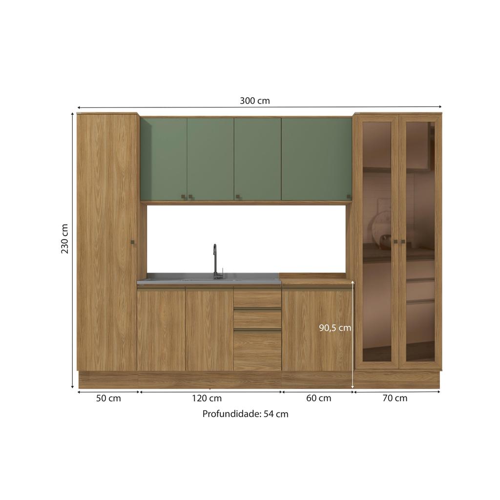 A perfeita união entre estilo e qualidade você encontra no Combo CB1307 da Cozinha Celeste da Kappesberg. Produzida em chapa MDF de 15mm, ela garante robustez, firmeza e qualidade, além de um acabamento perfeito. E com até sete camadas de pintura, a caixaria e as frentes dos balcões, paneleiros e cristaleira são em pintura touch na cor nogueira, com a textura dos veios da madeira, enquanto as frentes dos aéreos são na cor verde oliva e acabamento fosco. Uma combinação linda e moderna, que remetendo aos tons da natureza, dará ainda mais destaque e aconchego ao seu espaço, deixando sua cozinha perfeita. Com seis módulos mais tampo, o conjunto possui 2,30m de altura e 3m de largura, combinando estilo e qualidade para todos os ambientes. Esse conjunto ainda conta com cristaleira, com moldura e vidro reflecta, garantindo sofisticação e um detalhe único ao projeto. E com amplo espaço, você poderá organizar louças e mantimentos, além de preparar receitas especiais e deliciosas para receber sua família ou amigos. Para um melhor acabamento, a cozinha possui rodapés, mas também acompanha as ferragens para ser montada suspensa, do jeito que você preferir. Os diferenciais ficam por conta das dobradiças com amortecimento, garantindo um fechamento suave e sem ruídos, das corrediças telescópicas e os puxadores na cor dourada, complementando o estilo e qualidade do produto. Viva momentos especiais e renove seu espaço com a Cozinha Celeste da Kappesberg. Informações importantes: As imagens são meramente ilustrativas, não acompanha acessórios; Pode haver variação de cor de acordo com a calibragem da tela onde o produto está sendo visualizado;Todos nossos móveis são entregues desmontados; A montagem é sempre por conta do cliente (orientamos a contratação de um profissional qualificado, o manual de montagem acompanha o produto); O vídeo do produto pode ser genérico, então atente-se às imagens do anúncio para optar pela cor/modelo; Compõe a cozinha: 1x Paneleiro Celeste Kappesberg 100% MDF 1 Porta Nogueira 50cm; 1x Cristaleira Celeste Kappesberg 100% MDF 2 Portas 1 Gaveta Nogueira 72cm; 1x Balcão de Pia Celeste Kappesberg 100% MDF 2 Portas 3 Gavetas Nogueira 120cm; 1x Balcão Celeste Kappesberg 100% MDF 1 Porta Nogueira 60cm; 1x Tampo Para Balcão Kappesberg Nogueira 60cm; 1x Armário Aéreo Celeste Kappesberg 100% MDF 1 Porta Nogueira/Verde 60cm; 1x Armário Aéreo Celeste Kappesberg 100% MDF 3 Portas Nogueira/Verde 120cm; *Obs.: Cuba de pia/Tampo de 120cm não acompanham a cozinha. Características: Material em MDF de 15mm de espessura, com tampos em MDP; Puxadores de metal na cor dourado; Corrediças telescópicas; O rodapé possui 16 centímetros de altura; Rodapés, 10 portas e 3 Gavetas. Dimensões: Largura: 300cm; Altura do Balcão: 88cm; Profundidade Inferior: 52cm / Superior: 37cm.