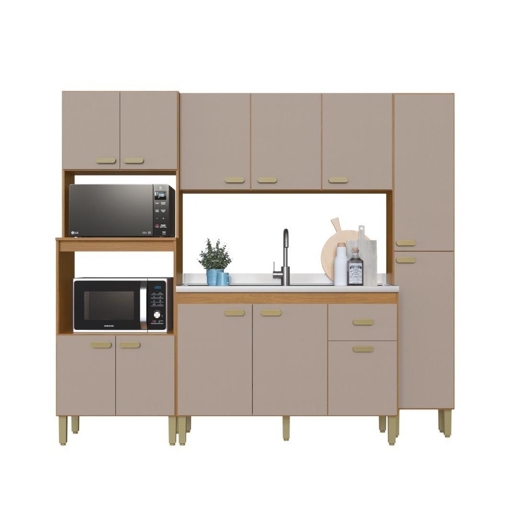 Cozinha Modulada Compacta Fidelitá Mariana 4 Peças 220cm 12 Portas 1 Gaveta Sem Tampo Freijó/Camurça