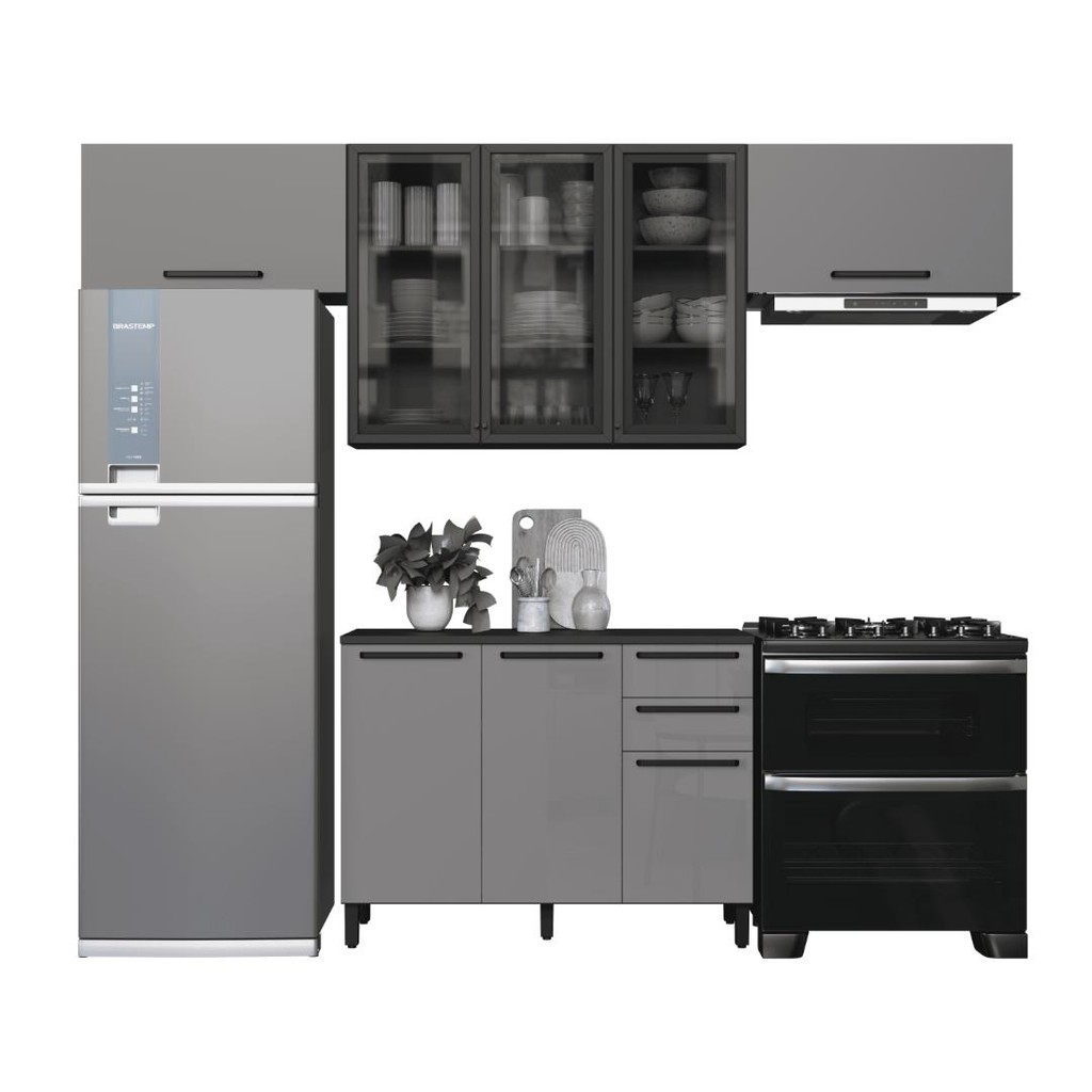 Cozinha Modulada Compacta Fidelitá Mônaco 4 Peças 280cm 8 Portas 2 Gavetas Com Tampo Chumbo/Titânio