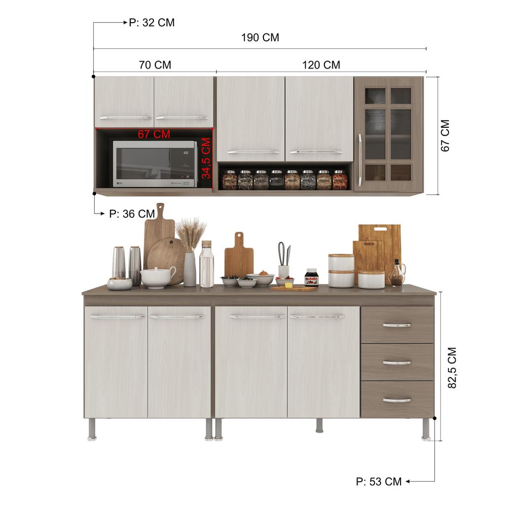 A Cozinha Paris da Fidelitá combina elegância e funcionalidade, trazendo um design sofisticado com linhas delicadas e acabamento em pintura UV de alta qualidade. O padrão Nogal, com brilho, adiciona um toque de sofisticação e aconchego ao ambiente, enquanto o Salinas em acabamento fosco garante modernidade, leveza visual e fácil harmonização com diferentes estilos de decoração, tornando sua cozinha mais bonita, atual e acolhedora no dia a dia. Com módulos avulsos, cada peça é independente, permitindo diferentes composições para melhor aproveitamento do espaço. Seu interior é bem distribuído, com prateleiras e divisórias que auxiliam na organização de utensílios e mantimentos. Fabricada em MDP de 15mm, a estrutura garante resistência e durabilidade, enquanto as portas de vidro em MDF de 15mm elevam o padrão de qualidade e sofisticação do produto. As corrediças telescópicas e dobradiças metálicas proporcionam um deslizamento suave e seguro. Além disso, os puxadores cromados em ABS e os pés plásticos com regulagem de altura agregam praticidade e um toque moderno ao conjunto. Dimensões: Largura total: 190cm Profundidade: 53cm (balcões) | 32cm (aéreos) Os balcões acompanham tampos de MDP 15mm removíveis, possibilitando a instalação de uma pia com espaço de 120cm x 53cm no balcão (120cm). O balcão (70cm) suporta cooktop, o mesmo não vai recortado e para sua customização o gabarito esta na própria embalagem. Itens inclusos: - Aéreo (120cm) – 3 portas (1 de vidro) - Armário de 70cm com duas (2) portas com espaço para forno/micro-ondas sendo (Altura: 34,5cm x Largura: 67cm x Profundidade: 36cm) - Balcão (120cm) – 3 portas, 3 gavetas e tampo removível - Balcão (70cm)- 2 portas e tampo Observação: A Fidelitá Móveis não realiza montagem. O produto é enviado desmontado, acompanhado de manual de instalação e todas as ferragens necessárias. Garantia: 6 meses para defeitos de fabricação e vícios ocultos. Imagem meramente ilustrativa. Por segurança, é necessário fixar os módulos na parede. Dúvidas P: Os módulos podem ser montados separadamente ou apenas na disposição da imagem? Sim! Como os módulos são avulsos, você pode organizá-los conforme seu espaço e necessidade. P: O balcão suporta pia de inox ou granito? Sim! O tampo de MDP de 15mm pode ser removido para instalação de uma pia de até 120cm x 53cm pesando até 40kg. P: Os pés da cozinha são reguláveis? Sim! Os pés são de plástico resistente e possuem 14cm padrões e regulagem para nivelamento do móvel acrescentando mais 3cm sobre a altura total. P: A Fidelitá realiza a montagem da cozinha? Não. O produto é enviado desmontado, acompanhado pelo manual de montagem e todas as ferragens necessárias para a instalação. P: Os puxadores são de metal? Não. Os puxadores são em ABS cromado, garantindo leveza e resistência.
