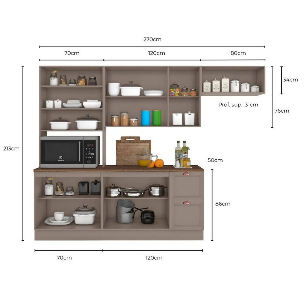 A Cozinha Modulada Completa com Paneleiro Duplo Cristaleira Unna é uma composição elegante com portas almofadadas/molduradas em MDF inspirada nas clássicas cozinhas americanas. Amplo espaço interno, nicho para micro-ondas (A.45cmxL.67cmxP.48cm) com 2 portas molduradas com vidro incolor, aéreo triplo com prateleira, aéreo 1 porta basculante com pistão a gás e balcão com tampo 27cm que se retirado pode ser utilizado para pia de 120x50cm. Produto com corrediças telescópicas, dobradiças reforçadas de 35cm, puxadores modelo retro em polímero, pés reguláveis em PVC 14,5cm e rodapés removíveis com presilhas modelo click. Estrutura em MDP Perffect Touch de maior resistência. São 4 peças: paneleiro duplo, aéreo triplo, aéreo geladeira, balcão 120cm com tampo. Praticidade Poliman em seus produtos. Estilo: Moderno Modular: Sim Peso (kg): 118 Garantia: 03 Meses Altura (cm): 213 Acabamento: BP Melamínico Largura (cm): 270 Possui Pés: Sim Possui Vidro: Sim Possui Portas: Sim Tipo de Porta: Misto (Bater e Basculante) Altura dos Pés: 14.5 Pés Reguláveis: Sim Possui Gavetas: Sim Possui Rodízio: Não Suporta Até (kg): 87 Acompanha Tampo: Sim Profundidade (cm): 50 Escala de Brilho: Fosco Gaveta com Chave: Não Material dos Pés: PVC Material da Porta: MDP Material do Fundo: HDF Material do Tampo: MDP Origem do Produto: Nacional Acabamento dos Pés: Polipropileno Ambiente Principal: Cozinha Balcão Suporta Pia: Sim Espessura do Tampo (mm): 15 Material da Gaveta: MDP Material Principal: MDP Possui Prateleiras: Sim Acabamento da Porta: BP Melamínico Quantidade de Peças: 4 Sapatas Niveladoras: Não Acabamento da Gaveta: BP Melamínico Balcão Acompanha Pia: Não Material da Corrediça: Metálica Material da Prateleira: MDP Peso Máximo por Gaveta: 3 Acabamento da Prateleira: BP Melamínico Tipo de Puxador da Porta: Externo Escala de Brilho da Porta: Fosco Tipo de Puxador da Gaveta: Externo Escala de Brilho da Gaveta: Fosco Peso Máximo por Prateleira: 3 Tipo de Armário de Cozinha: Cozinha Compacta Possui Recorte para Cooktop: Não Tipo de Corrediça da Gaveta: Metálica Telescópica Material do Puxador da Porta: Plástico Material do Puxador da Gaveta: Plástico Escala de Brilho da Prateleira: Fosco Informações Complementares (Novo): Nicho para forno, balcão pode ser usado para pia 120x50cm, dobradiças 35mm, corrediças telescópicas, pistão a gás, pés reguláveis com rodapés removíveis com presilhas modelo click, portas/frente de gavetas molduradas em MDF, produto em MDP Perffect Touch. Espessura do Material da Estrutura: 15 Medida de Cada Item (A x L x P) (novo): Paneleiro Duplo: 213x70cm Profundidade Superior 31cm e Profundidade Inferior 50cm | Aéreo Triplo: 76x120x31cm | Aéreo Basculante: 34,4x80x31cm | Balcão com Tampo: 86,2x120x50cm Tipo de Dobradiça/Corrediça da Porta: 35 mm Material da Dobradiça/Corrediça da Porta: Metálica Marca: Poliman Móveis Cor Flex: Não Cor Interna: Cinza Cor: Gris Cor do Produto: Gris Itens Inclusos: 1 Paneleiro duplo, 1 Aéreo triplo, 1 Aéreo Basculante, 1 Balcão 120cm com Tampo, Kit Ferragens e Manual de Montagem Cor Predominante: Cinza Linha ou Coleção: Unna Quantidade de Prateleiras: 03 Prateleiras Quantidade de Portas: 10 Portas Tamanho Indicado da Pia (L x C): 120x50cm Quantidade de Gavetas: 02 Gavetas Tamanho Indicado do Tampo (L x P): 120x50cm