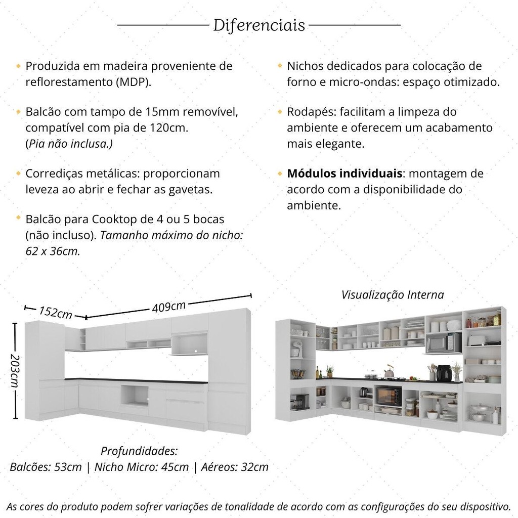 Cozinha Modulada Completa Canto 409cm com Rodapé e Balcão para Cooktop Veneza Multimóveis MP2304