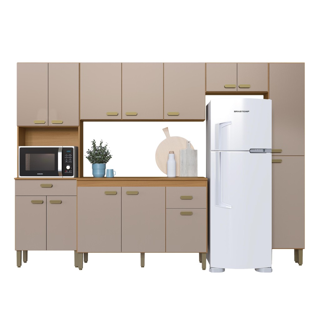 Cozinha Modulada Completa Fidelitá Mariana 5 Peças 285cm 14 Portas 2 Gavetas Com Tampo Freijó/Camurça