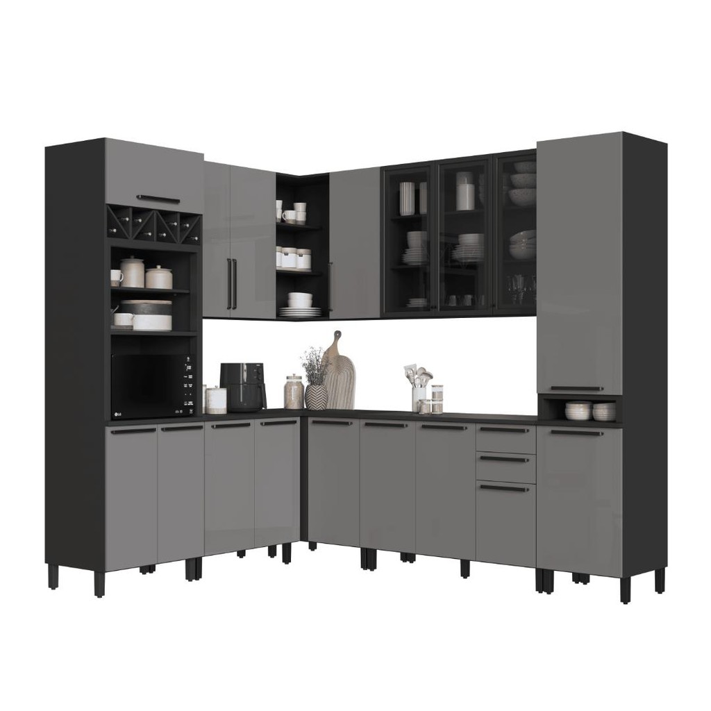 Cozinha Modulada Completa Fidelitá Mônaco 8 Peças 449cm 17 Portas 2 Gavetas Com Tampo Chumbo/Titânio