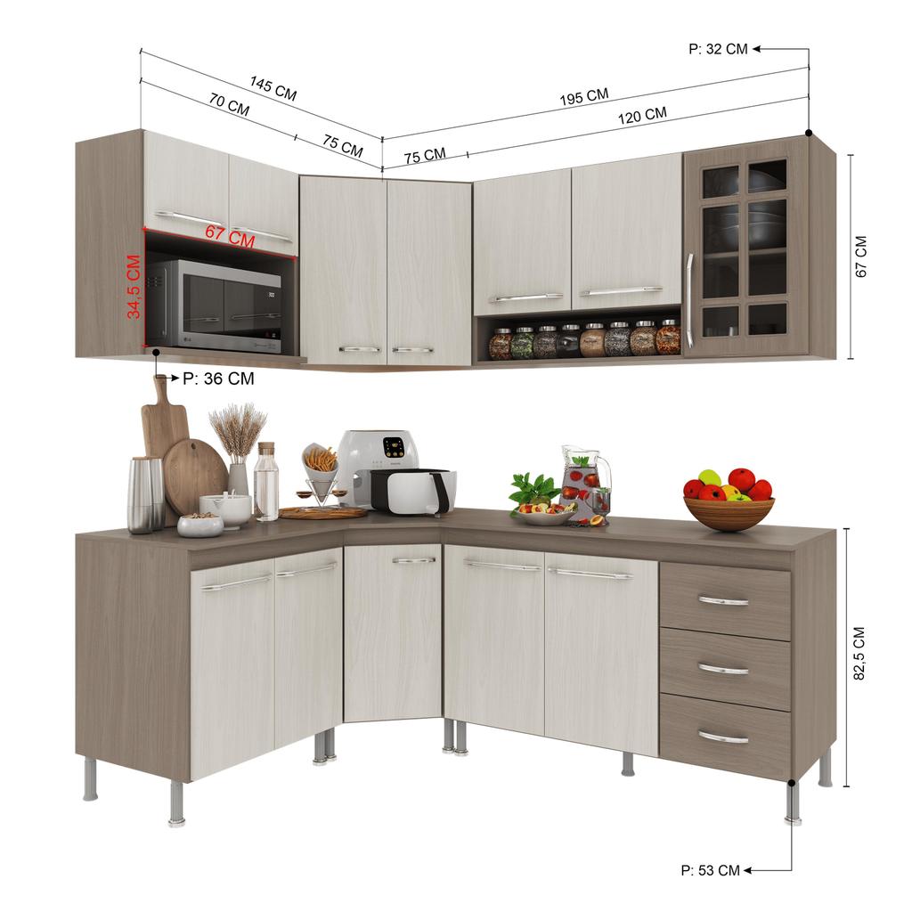A Cozinha Paris da Fidelitá combina elegância e funcionalidade, trazendo um design sofisticado com linhas delicadas e acabamento em pintura UV de alta qualidade. O padrão Nogal, com brilho, adiciona um toque de sofisticação e aconchego ao ambiente, enquanto o Salinas em acabamento fosco garante modernidade, leveza visual e fácil harmonização com diferentes estilos de decoração, tornando sua cozinha mais bonita, atual e acolhedora no dia a dia. Com módulos avulsos, cada peça é independente, permitindo diferentes composições para melhor aproveitamento do espaço. Seu interior é bem distribuído, com prateleiras e divisórias que auxiliam na organização de utensílios e mantimentos. Fabricada em MDP de 15mm, a estrutura garante resistência e durabilidade, enquanto as portas de vidro em MDF de 15mm elevam o padrão de qualidade e sofisticação do produto. As corrediças telescópicas e dobradiças metálicas proporcionam um deslizamento suave e seguro. Além disso, os puxadores cromados em ABS e os pés plásticos com regulagem de altura agregam praticidade e um toque moderno ao conjunto. Dimensões: Largura total: 340cm Profundidade: 53cm (balcões) | 32cm (aéreos) Os balcões acompanham tampos de MDP 15mm removíveis, possibilitando a instalação de uma pia com espaço de 120cm x 53cm no balcão (120cm). O balcão (70cm) suporta cooktop, o mesmo não vai recortado e para sua customização o gabarito esta na própria embalagem. Itens inclusos: - Aéreo (120cm) – 3 portas (1 de vidro) - Aéreo de Canto (75cm) - 2 portas - Armário (70cm) - 2 portas, com espaço para forno/micro-ondas sendo (Altura: 34,5cm x Largura: 67cm x Profundidade: 36cm) - Balcão (120cm) – 3 portas, 3 gavetas e tampo removível - Balcão de Canto (75cm) - 1 porta - Balcão (70cm)- 2 portas e tampo Observação: A Fidelitá Móveis não realiza montagem. O produto é enviado desmontado, acompanhado de manual de instalação e todas as ferragens necessárias. Garantia: 6 meses para defeitos de fabricação e vícios ocultos. Imagem meramente ilustrativa. Por segurança, é necessário fixar os módulos na parede. Dúvidas P: Os módulos podem ser montados separadamente ou apenas na disposição da imagem? Sim! Como os módulos são avulsos, você pode organizá-los conforme seu espaço e necessidade. P: O balcão suporta pia de inox ou granito? Sim! O tampo de MDP de 15mm pode ser removido para instalação de uma pia de até 120cm x 53cm pesando até 40kg. P: Os pés da cozinha são reguláveis? Sim! Os pés são de plástico resistente e possuem 14cm padrões e regulagem para nivelamento do móvel acrescentando mais 3cm sobre a altura total. P: A Fidelitá realiza a montagem da cozinha? Não. O produto é enviado desmontado, acompanhado pelo manual de montagem e todas as ferragens necessárias para a instalação. P: Os puxadores são de metal? Não. Os puxadores são em ABS cromado, garantindo leveza e resistência.