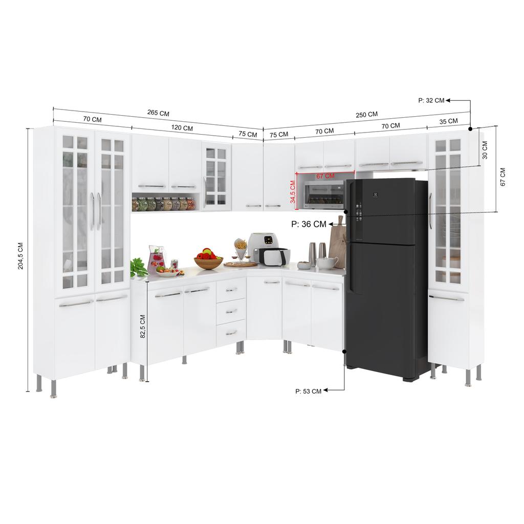 A Cozinha Viena da Fidelitá combina elegância e funcionalidade, trazendo um design sofisticado com linhas delicadas e um acabamento em pintura UV de alto brilho. Com módulos avulsos, cada peça é independente, permitindo diferentes composições para melhor aproveitamento do espaço. Seu interior é bem distribuído, com prateleiras e divisórias que auxiliam na organização de utensílios e mantimentos. Fabricada em MDP de 15mm, a estrutura garante resistência e durabilidade, enquanto as portas de vidro em MDF de 15mm elevam o padrão de qualidade e sofisticação do produto. As corrediças telescópicas e dobradiças metálicas proporcionam um deslizamento suave e seguro. Além disso, os puxadores cromados em ABS e os pés plásticos com regulagem de altura agregam praticidade e um toque moderno ao conjunto. Dimensões: Largura total: 515cm Altura total: 204,5cm Profundidade: 53cm (balcões) | 32cm (aéreos) Os balcões acompanham tampos de MDP 15mm removíveis, possibilitando a instalação de uma pia com espaço de 120cm x 53cm no balcão (120cm). O balcão (70cm) suporta cooktop, o mesmo não vai recortado e para sua customização o gabarito esta na própria embalagem. Itens inclusos: - Paneleiro Duplo (70cm) com quatro 4 portas, (2 de vidro) - Aéreo (120cm) – 3 portas (1 de vidro) - Balcão (120cm) – 3 portas, 3 gavetas e tampo removível - Aéreo de Canto (75cm) - 2 portas - Balcão de Canto (75cm) - 1 porta - Balcão (70cm)- 2 portas e tampo - Armário (70cm) - 2 portas, com espaço para forno/micro-ondas sendo (Altura: 34,5cm x Largura: 67cm x Profundidade: 36cm) - Aéreo (70cm) – 2 portas - Paneleiro Simples (35cm) – 2 portas (1 de vidro) Observação: A Fidelitá Móveis não realiza montagem. O produto é enviado desmontado, acompanhado de manual de instalação e todas as ferragens necessárias. Garantia: 6 meses para defeitos de fabricação e vícios ocultos. Imagem meramente ilustrativa. Por segurança, é necessário fixar os módulos na parede. Dúvidas P: Os módulos podem ser montados separadamente ou apenas na disposição da imagem? Sim! Como os módulos são avulsos, você pode organizá-los conforme seu espaço e necessidade. P: O balcão suporta pia de inox ou granito? Sim! O tampo de MDP de 15mm pode ser removido para instalação de uma pia de até 120cm x 53cm pesando até 40kg. P: Os pés da cozinha são reguláveis? Sim! Os pés são de plástico resistente e possuem 14cm padrões e regulagem para nivelamento do móvel acrescentando mais 3cm sobre a altura total. P: A Fidelitá realiza a montagem da cozinha? Não. O produto é enviado desmontado, acompanhado pelo manual de montagem e todas as ferragens necessárias para a instalação. P: Os puxadores são de metal? Não. Os puxadores são em ABS cromado, garantindo leveza e resistência.