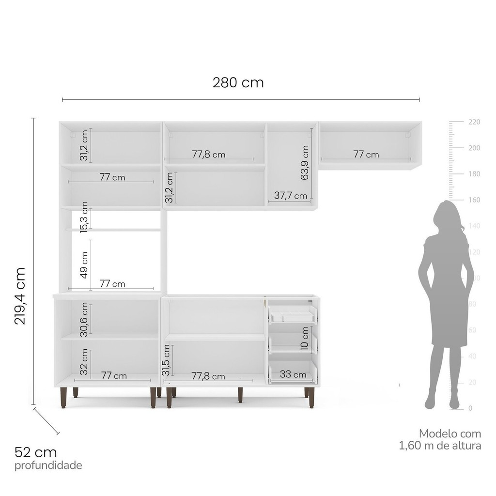 A Cozinha Pérola Completa possui 4 peças com altura de 219,4 cm largura de 280 cm e profundidade de balcão de 52 cm. Com portas e gavetas em MDF usinadas em baixo relevo, possui estilo Americano e design contemporâneo, funcional e prático para seu dia a dia. Seus puxadores dos módulos inferior são no formato de concha. E na parte superior são modelo pontual, ambos na cor cobre. Possui dobradiças 3,5cm Slide On (sistema de amortecimento anti batida) e na porta basculante possui além das dobradiças Slide On pistão para proporcionar uma maior abertura. Estilo: Americana Modular: Sim Peso (kg): 121.79 Garantia: 06 Meses Altura (cm): 219.4 Acabamento: Pintura Largura (cm): 280 Possui Pés: Sim Possui Vidro: Não Possui Portas: Sim Tipo de Porta: Misto (Bater e Basculante) Altura dos Pés: 17 Pés Reguláveis: Sim Possui Gavetas: Sim Possui Rodízio: Não Suporta Até (kg): 10 Acompanha Tampo: Não Profundidade (cm): 52 Escala de Brilho: Fosco Gaveta com Chave: Não Material dos Pés: Plástico Material da Porta: MDF Origem do Produto: Nacional Acabamento dos Pés: Poliéster Ambiente Principal: Cozinha Balcão Suporta Pia: Sim Material da Gaveta: MDF Material Principal: MDF/MDP Possui Prateleiras: Sim Acabamento da Porta: Pintura Quantidade de Peças: 4 Sapatas Niveladoras: Sim Acabamento da Gaveta: Pintura Balcão Acompanha Pia: Não Material da Corrediça: Metálica Material da Prateleira: MDP Peso Máximo por Gaveta: 5 Acabamento da Prateleira: Pintura Tipo de Puxador da Porta: Externo Escala de Brilho da Porta: Fosco Tipo de Puxador da Gaveta: Externo Escala de Brilho da Gaveta: Fosco Peso Máximo por Prateleira: 10 Tipo de Armário de Cozinha: Cozinha Compacta Acompanha Rodapé Decorativo: Não Possui Recorte para Cooktop: Não Tipo de Corrediça da Gaveta: Metálica Telescópica Material do Puxador da Porta: Plástico Material do Puxador da Gaveta: Plástico Escala de Brilho da Prateleira: Fosco Medida de Cada Item (A x L x P) (novo): Paneleiro/Torre Quente: 219,4 x 80 x 52 Balcão: 84 x 120 x 50,5 Aéreo: 67 x 120 x 36,5 Basculante: 33,5 x 80 x 36,5 Material da Dobradiça/Corrediça da Porta: Metálica Marca: Yescasa Cor Flex: Não Cor Interna: Branco Cor: Branco/Cinza Cor do Produto: Branco/Cinza Itens Inclusos: 1 móvel desmontado+ 1 kit de ferragens + 1 termo de garantia e + 1 manual de montagem. Cor Predominante: Cinza Linha ou Coleção: Pérola Quantidade de Prateleiras: 04 Prateleiras Tamanho Indicado da Pia (L x C): L: 120 x P: 52 cm Quantidade de Gavetas: 03 Gavetas Tamanho Indicado do Tampo (L x P): L: 120 x P: 52 cm