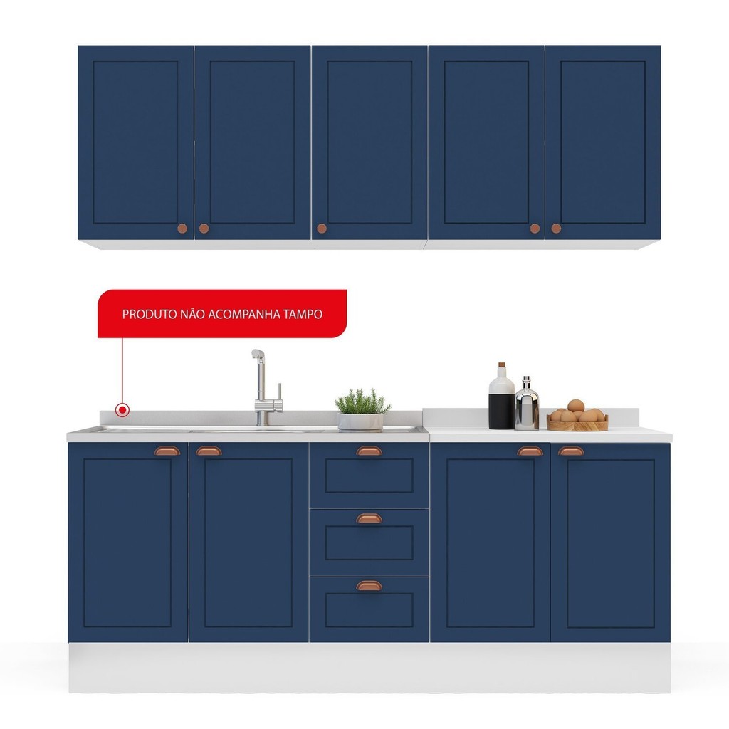 Cozinha Pérola com Rodapé 4 Peças Aéreos com 5 Portas, Balcão 2 Gavetas 3 Portas e Balcão 2 Portas Y Branco/Azul
