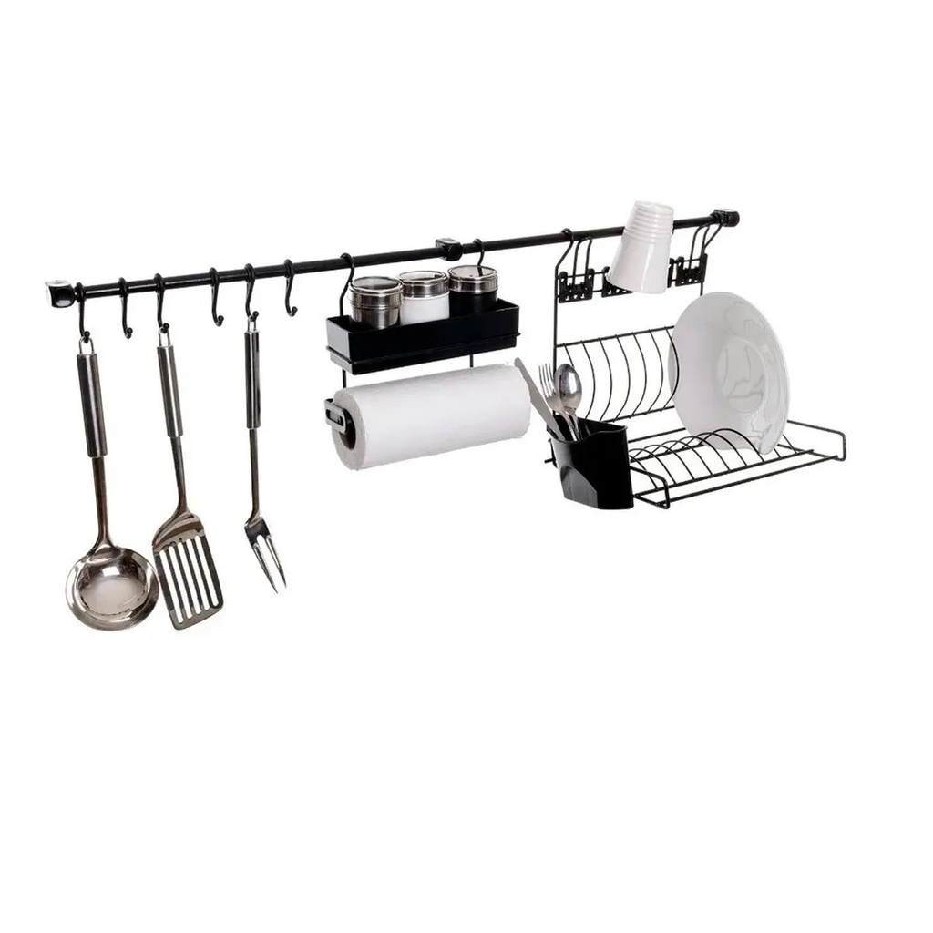 BEM VINDO A ESTRELA DO LAR O conjunto ideal para a higienização de louças, organização e praticidade em sua cozinha. Composto por uma barra fixada na parede, esse item inclui um escorredor de louças dobrável com a capacidade para 8 pratos e 4 copos, 6 Gancho para acessórios como escumadeira, espátula e entre outros, porta rolo de papel toalha e complementando com espaço para temperos. As peças são soltas da barra e podem ser posicionadas conforme a preferência. (a imagem é apenas uma sugestão de uso) Feito em metal com proteção de resina termoplástica, tendo grande durabilidade e sendo resistente a ambientes úmidos. CARACTERÍSTICAS - Cor: Preto - Dimensões após instalação: 90 x 26 x 33 cm - Material: aço com proteção termoplástica. Ganchos em ABS. ITENS INCLUSOS: - 02 barras 45 cm - 06 ganchos - 01 escorredor dobrável - 01 porta rolo de papel toalha - 01 porta potes de tempero e condimentos - 01 kit fixação Agradecemos a preferência. Atenciosamente equipe Estrela do Lar.