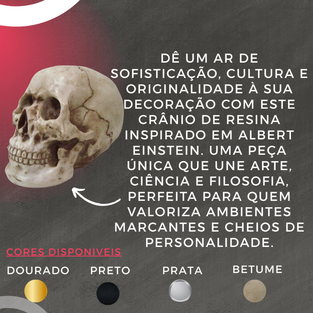 Dê um ar de sofisticação, cultura e originalidade à sua decoração com este crânio de resina inspirado em Albert Einstein. Uma peça única que une arte, ciência e filosofia, perfeita para quem valoriza ambientes marcantes e cheios de personalidade. ✨ Destaques e benefícios: Design exclusivo: inspirado em Einstein, símbolo de genialidade, curiosidade e sabedoria. Acabamento artesanal: cada peça é pintada e detalhada à mão, garantindo autenticidade e exclusividade. Decoração impactante: ideal para criar um ambiente com toque intelectual, misterioso e elegante, seja em casa, escritório ou loja. Versatilidade de uso: combina com estilos clássicos, modernos, temáticos ou até mesmo alternativos, compondo cenários únicos. Durável e resistente: feito em resina premium, é leve para manusear e resistente ao desgaste, mantendo-se impecável por muito tempo. Peça de conversa: desperta curiosidade, admiração e sempre rende comentários, tornando-se destaque em qualquer espaço. Presente sofisticado: perfeito para surpreender colecionadores, cientistas, professores ou amantes da filosofia e decoração diferenciada. 📏 Medidas: Comprimento: 19,3 cm Largura: 12 cm Altura: 16 cm Peso: 0,950 kg 💡 Sugestão de estilo: posicione-o sobre estantes, mesas de estudo, prateleiras de livros ou vitrines para realçar a atmosfera intelectual e inspiradora do espaço. 📦 Envio rápido e seguro para todo o Brasil! 🌟 Garanta já o seu e leve para a sua decoração um símbolo de criatividade, genialidade e mistério!