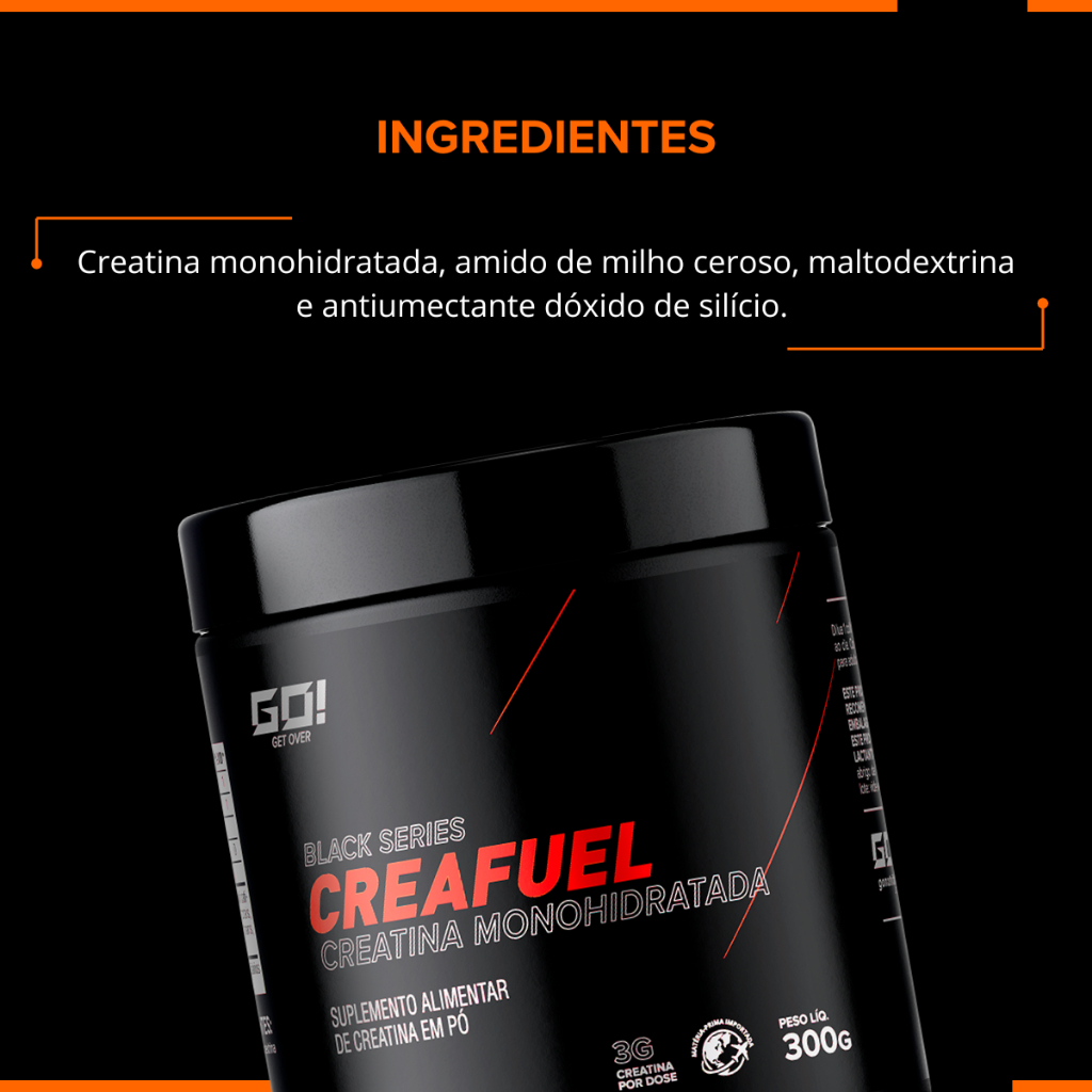 Creafuel – GO Nutrition A Creafuel é um suplemento alimentar em pó que combina creatina monohidratada e carboidratos, destinado ao consumo por praticantes de atividades físicas. A creatina é um composto naturalmente presente no organismo e amplamente utilizada como complemento alimentar, enquanto os carboidratos compõem a base energética da formulação. Cada porção fornece 3 g de creatina, conforme informação nutricional do produto. Composição Creatina monohidratada, amido de milho ceroso, maltodextrina e antiumectante dióxido de silício. Modo de uso Diluir 6 g (1 colher de chá) em água ou bebida de sua preferência. Consumir conforme orientação de profissional de saúde ou nutricionista. Apresentação Pote contendo 300 g de suplemento em pó. Avisos gerais Este produto não é um medicamento. Não exceder a recomendação diária de consumo indicada na embalagem. Gestantes, nutrizes, crianças, idosos e pessoas com enfermidades devem consultar um profissional de saúde antes do consumo. Manter fora do alcance de crianças. Produto isento de registro conforme RDC nº 27/2010 e RDC nº 240/2018.