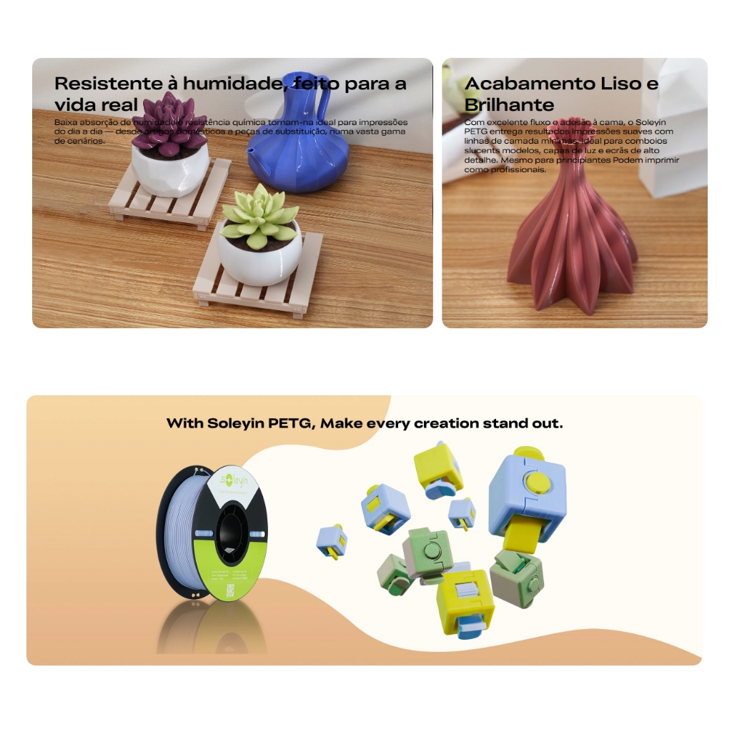 FILAMENTO Soleyin PETG - Alta Performance e Compatibilidade para Sua Impressora 3D Desenvolvido para entregar resultados excepcionais em cada impressão, o filamento Soleyin PETG combina durabilidade, facilidade de uso e consciência ambiental. Perfeito para criadores, engenheiros e entusiastas que buscam confiabilidade e qualidade superior. ✨ DESTAQUES PRINCIPAIS: ✅ Impressão Suave e Sem Entupimentos Design patenteado e processo de fabricação avançado garantem fluxo contínuo e estável, eliminando interrupções e garantindo a conclusão bem-sucedida de seus projetos. ✅ Extrema Resistência e Durabilidade Formulado com alta tenacidade, oferece maior resistência a impactos e deformações, ideal para peças funcionais que exigem robustez. ✅ Ampla Compatibilidade Compatível com 99% das impressoras 3D FDM/FFF que possuem mesa aquecida, facilitando a adaptação sem necessidade de ajustes complexos. ✅ Material Renovável e Ecológico Produzido a partir de amido derivado de recursos vegetais renováveis, é uma escolha sustentável sem comprometer o desempenho. ⚙️ CONFIGURAÇÕES RECOMENDADAS DE IMPRESSÃO: Parâmetro Configuração Ideal Temperatura do Bico:210 - 250°C Temperatura da Mesa: 60 - 80°C Velocidade de Impressão: 30 - 200 mm/s Velocidade do Ventilador: 100% Tipo de Plataforma: Vidro Carbono Silício, PEI Tipo de Bico: Bico convencional 📊 PROPRIEDADES FÍSICO-MECÂNICAS: Nome do Produto: Soleyin PETG Densidade: 1,23 g/cm³ Resistência à Tração (X-Y): 45 MPa Alongamento na Ruptura (X-Y): 12% Resistência à Flexão (X-Y): 74 MPa 📦 ESPECIFICAÇÕES E EMBALAGEM: Diâmetro do Filamento: 1,75 mm Peso Líquido: 1 kg (2,2 lb) Peso Bruto: 1,29 kg (2,8 lb) Dimensões da Embalagem: 210 × 210 × 70 mm 💡 DICAS DE ARMAZENAMENTO E USO: ⚠️ Atenção: O PETG é higroscópico (absorve umidade do ar), o que pode afetar diretamente a qualidade da impressão. Mantenha o filamento em ambiente seco e bem ventilado. Evite exposição a calor intenso, luz solar direta ou umidade. Após aberto, se não for utilizar completamente em pouco tempo, armazene em um dry box (caixa de secagem) para preservar as propriedades do material e garantir impressões perfeitas. Pronto para elevar seus projetos de impressão 3D? Adquira já o Soleyin PETG e experimente a combinação perfeita entre resistência, facilidade de impressão e consciência ecológica! 🚀
