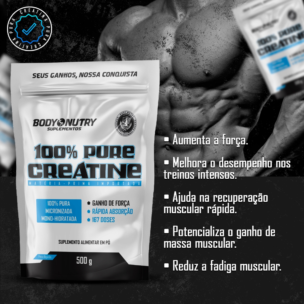 Creatina 100% Pure Body Nutry – 500g (Refil Econômico) A Creatina 100% Pure Body Nutry é um suplemento alimentar formulado com creatina monohidratada pura e micronizada, desenvolvida para atletas e praticantes de atividades físicas que buscam melhorar o desempenho, a força e a resistência muscular. Sua versão refil econômico oferece excelente custo-benefício, garantindo maior rendimento e praticidade no dia a dia. A creatina atua no fornecimento de energia para exercícios de alta intensidade e curta duração, auxiliando na melhora da performance durante os treinos. Por ser micronizada, apresenta melhor dissolução e aproveitamento, facilitando o consumo e a absorção pelo organismo. Com alto rendimento, o produto oferece aproximadamente 167 doses, sendo ideal para quem utiliza creatina de forma contínua e deseja manter um estoque duradouro sem abrir mão da qualidade. Principais benefícios: Auxilia no aumento da força e da resistência muscular Contribui para a melhora do desempenho físico em treinos intensos Apoia o ganho de massa muscular quando associado ao treino Fórmula micronizada para melhor dissolução e aproveitamento Alto rendimento com excelente custo-benefício Produto livre de glúten, lactose e açúcares. Indicado para adultos. Deve ser consumido conforme orientação da embalagem e não substitui uma alimentação equilibrada.