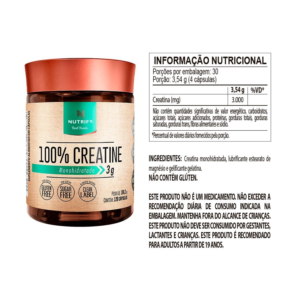 100% Creatine: Prática e Indispensável Os benefícios da suplementação de creatina são amplamente comprovados pela ciência. 100% Creatine em cápsulas Nutrify torna o consumo ainda mais prático, fornecendo 3g de creatina por dose. Fabricada com creatina monohidratada, garantindo alto grau de pureza, é livre de corantes, conservantes e aditivos, garantindo uma suplementação eficaz e segura.